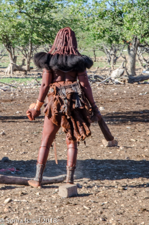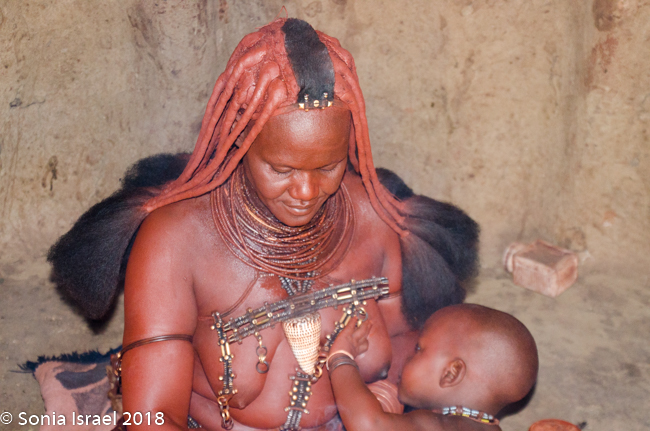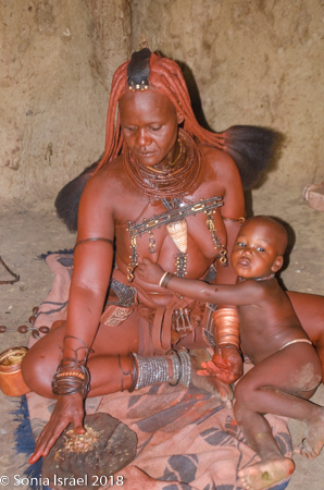 Our Himba guide invited us into her round hut. The hut, made of dung and mud, was empty except for a few kitchen tools. She showed us how she pounds ochre stone (hematite) into small pieces and then mixes those pieces with butter. She built a small fire to heat it all together and then rubbed it on her skin, and on Ueera’s arm so show us the true color.  Her baby was walking around the whole time, every now and then sitting next to her, grabbing her breast and nursing.