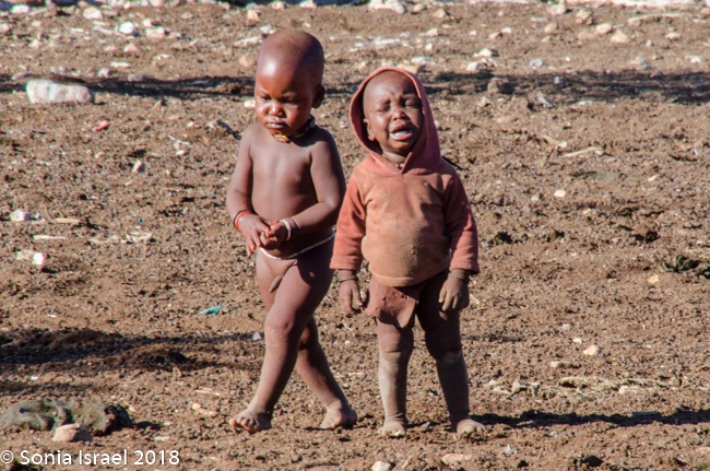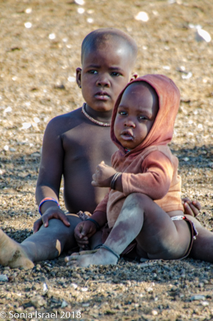 The Himba are one of the most interesting tribes I have visited or learned about. One of the head woman came over with Ueera and again, we said Mora. She, like all the Himba, was covered in orange paste and had long plaits of hair with black pom poms at the end of each braid. She wore lots of beads, a short goatskin skirt but was topless. There were babies and young children running around everywhere. There were also a few Herero children from a neighboring village. You can tell them apart because the Herero children are in Western clothes. And each child was more beautiful than the other. Both the Herero and the Himba have the most beautiful faces.