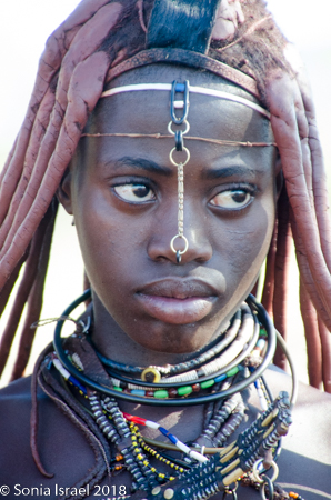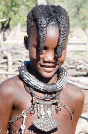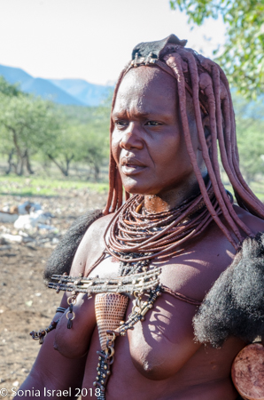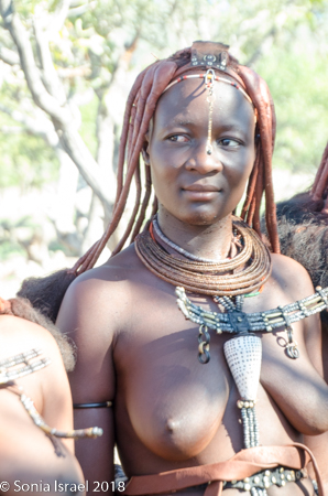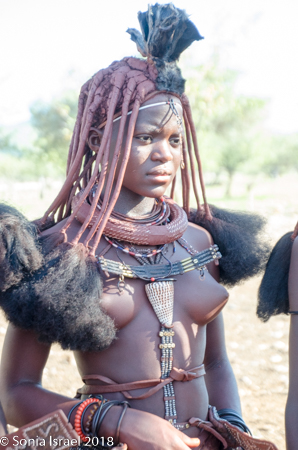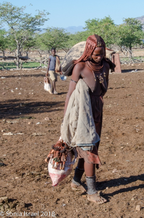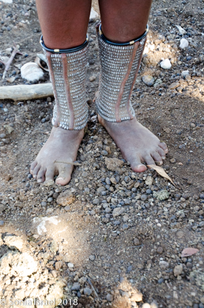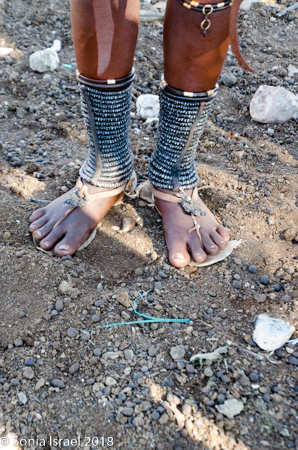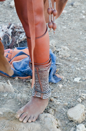 The adult Himba women all have tall. beaded anklets called omohanga. These are about six to eight inches high from their ankles up. They can hide their money here and also protect themselves against venomous animal bites. Married women with one child have one stripe on the omohanga while those with two or more children, have two stripes. In other words, everything they wear and everything they do with their hair communicates the message of who they are and what their status is.