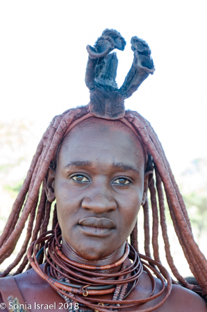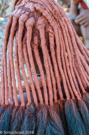 Hair also gives away a woman’s status. The young girls we saw had two braids (ozondato). Once a girl passes puberty, the two braids cover her face so the men know she is not ready to be married. When she is ready to marry, the braids are removed from her face so potential suitors can see her. Once she is married for at least one year, or when she has a child, she begins to wear a headdress, the erembe, made of cow or goat leather.