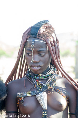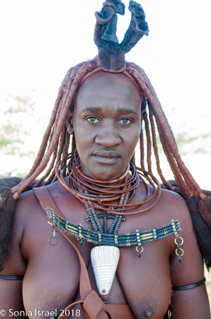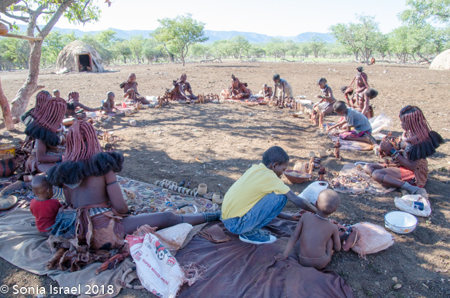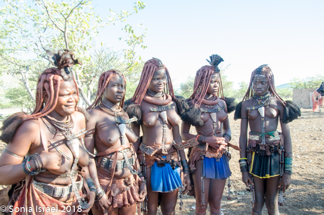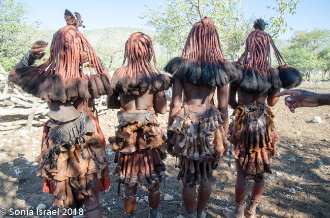 What Himba women wear and how they wear their hair informs observers about their status in society and in womanhood. It tells whether they have had their first period or whether their periods are now regular. It tells if they have had one child or two or more children. I mentioned that this woman, and all the others, wore a goatskin skirt which was embellished with shells and copper jewelry. The women all wear lots of beaded necklaces, particularly the married ones and the ohumba, a large white shell necklace which is passed from mother to daughter. I was able to buy one of the ohumba, and it was authentic, so I’m not sure how that fit into the “generation to generation.” Ueera had the women line up for us so he could teach us about the meaning of the different skirts and different beads.