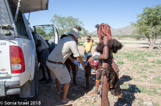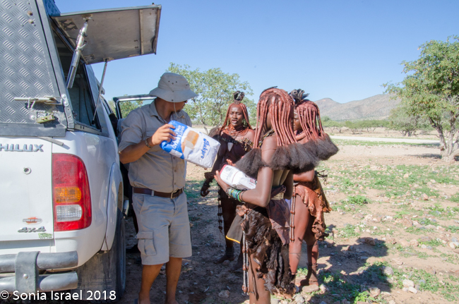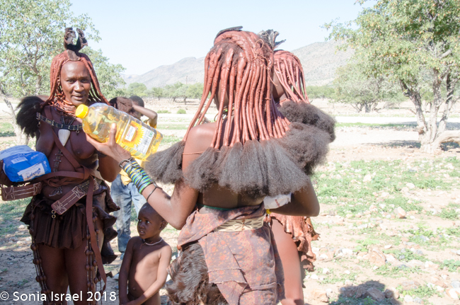Before we left, Charles and Ueera gave out gifts of large bottles of cooking oil, flour, sugar and tea. This was the “payment” for our visit (although I paid them in cash for my souvenirs). The Himba eat maize, milk and goat or sheep, saving the cow beef for special occasions. These gifts therefore, were very much appreciated as it saved them from walking to do the shopping at Sesfontein.