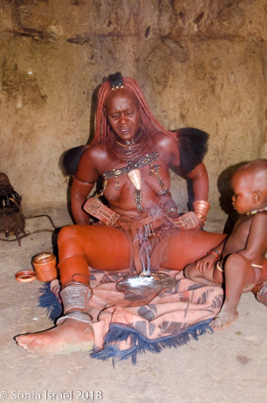 She also put some smoldering charcoal into a small bowl of herbs mixed with the wood of the Commiphora tree (see post, Namibia chapter 4, for a description of this tree) to create smoke. She fluttered her hand, gently pushing the smoke between her legs. This is how Himba women take a daily smoke bath in order to maintain personal hygiene.