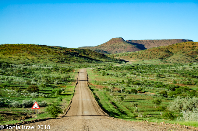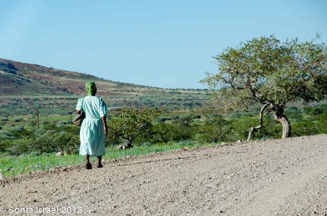 Charles had us leave right after breakfast. It would be a 4-5 hour drive to get to the airstrip where a bush plane would take us to Windhoek, where we would connect to a flight to Johannesburg. The sun was low on the horizon as we headed east and then south on C43. The sky was blue. We passed Herero villages and then Damara villages. The mountains were a purple-red. The fields were a lush green with little yellow flowers.