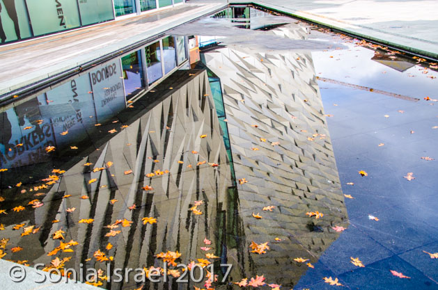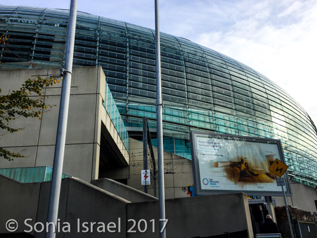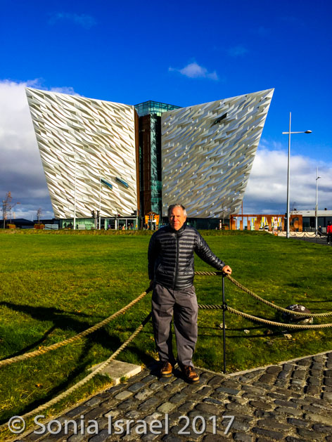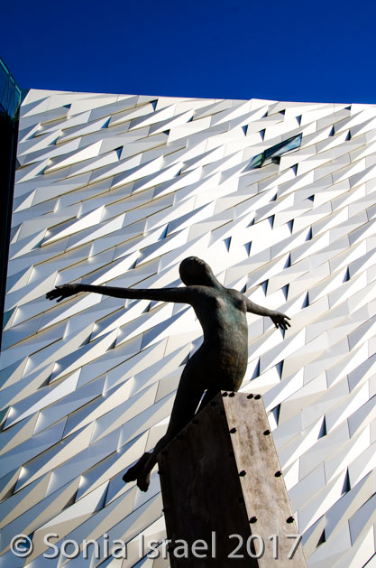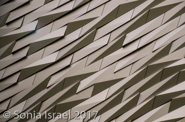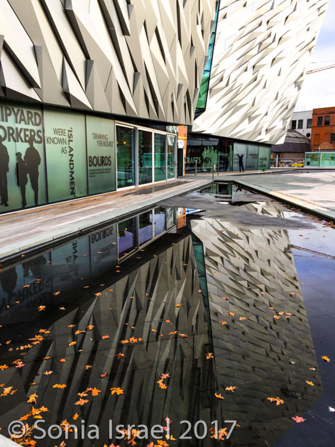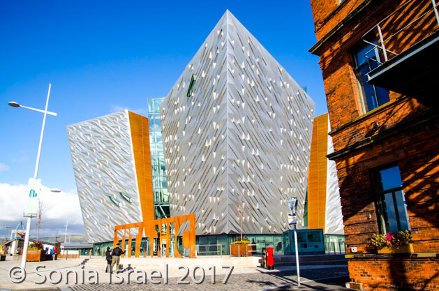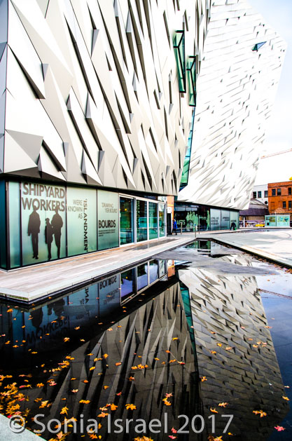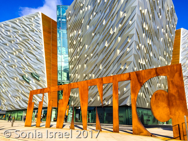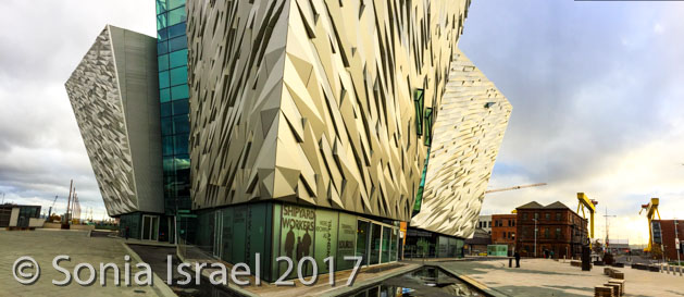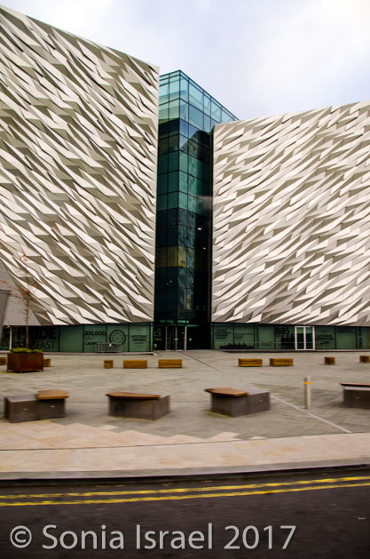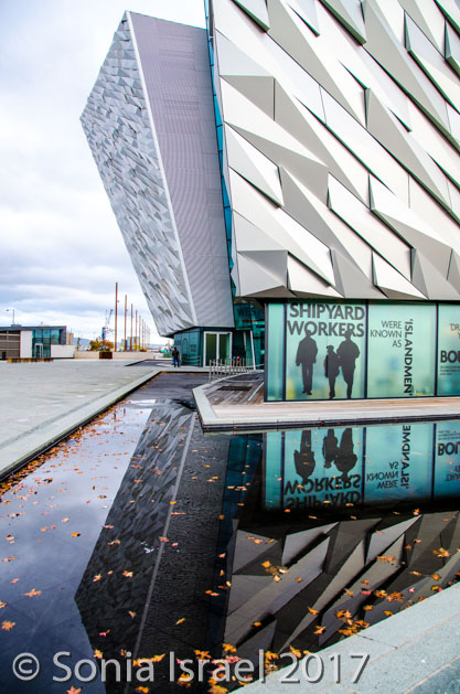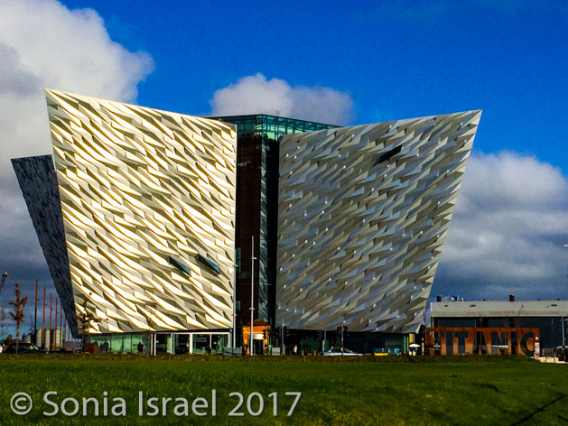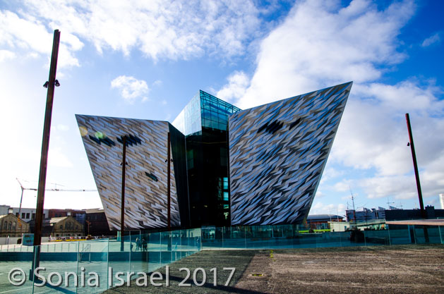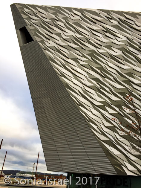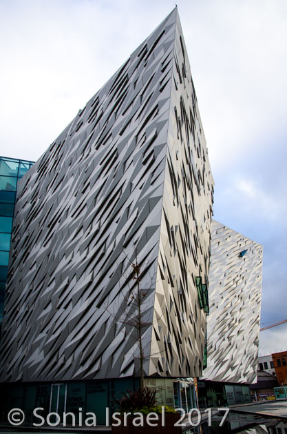 Our first major stop of our first full day in Belfast, was the Titanic museum, on the site of the former Harland and Wolff shipyard, where the Titanic and other ships were built (all ending in ic, like the Olympic or Britannic). It seems like that would not be particularly interesting but in fact it was an amazing museum which was beautifully done. The museum building itself is gorgeous with the design intended to reflect Belfast’s history of ship making and the industrial legacy left by Harland and Wolff. It was designed by Eric Kuhne and Associates. It is made up of three angles which look like the main prow of the ship. Some say it looks like an iceberg and the locals in fact call it “the iceberg.” It is covered in 3000 individual silver anodized aluminum shards standing 12 feet high, the same size as the Titanic’s hull.