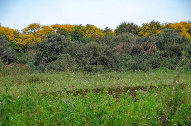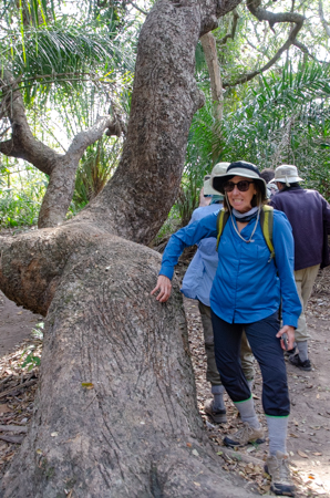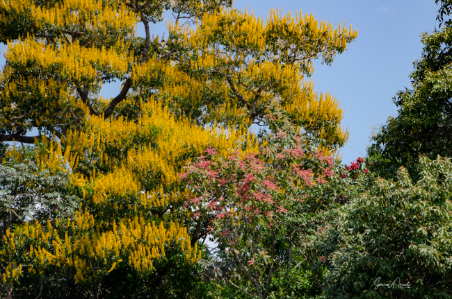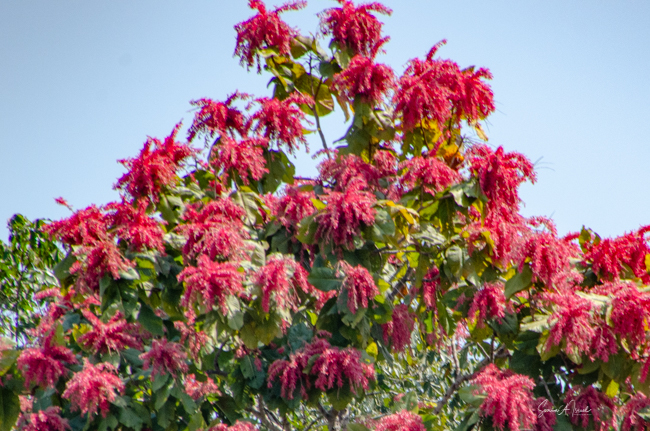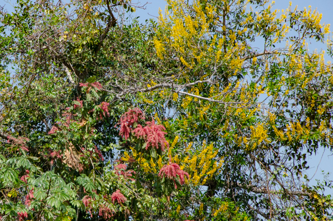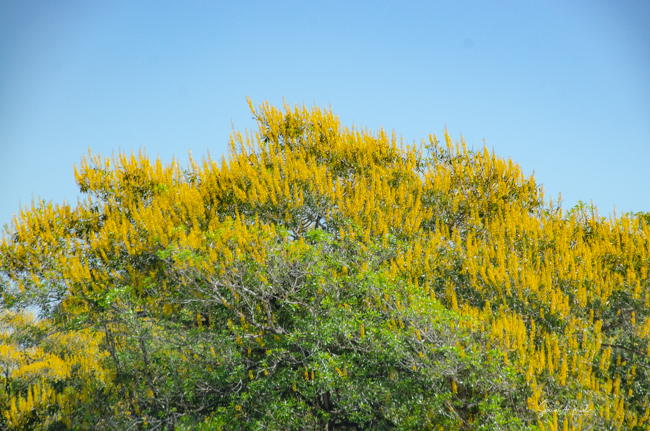 In addition to all the wonderful birds and animals, there were trees of all types everywhere. The most beautiful was a tree that was in full bloom with yellow flowers. Only later did I find out that it is called the Candelabra tree, a perfect name for this tree as the yellow flowers all faced up just like candles. It can grow up to 100 feet and the branches grow in a circle around the stems. As the tree grows and matures, the lower branches drop off, leaving a long, bare trunk with a crown of upturned branches tufted at the ends. Thus, a candelabra.