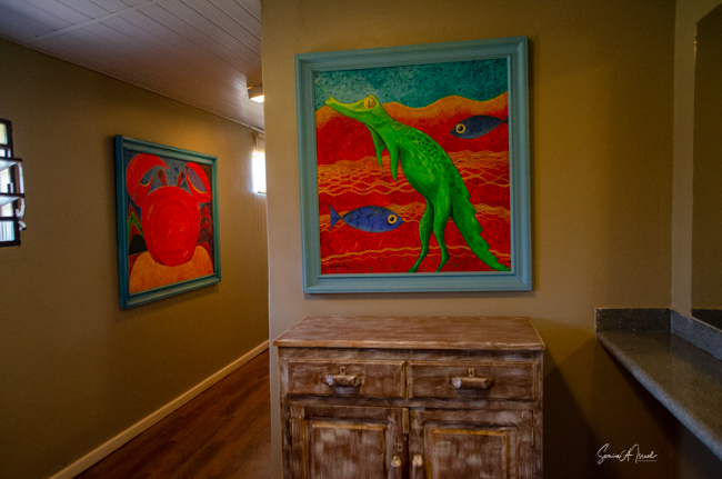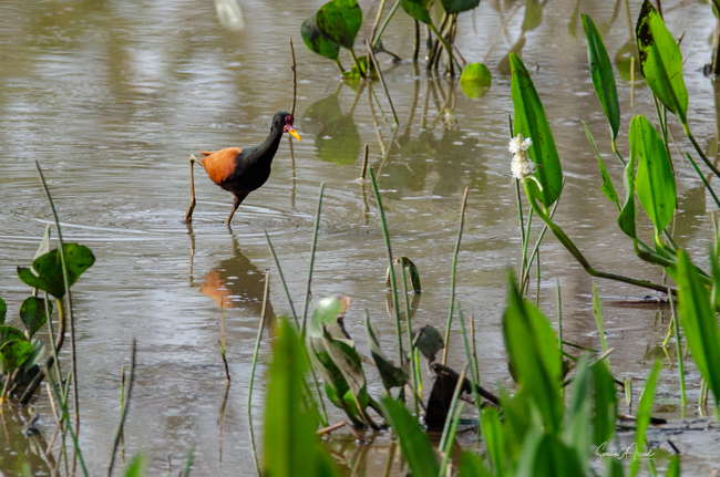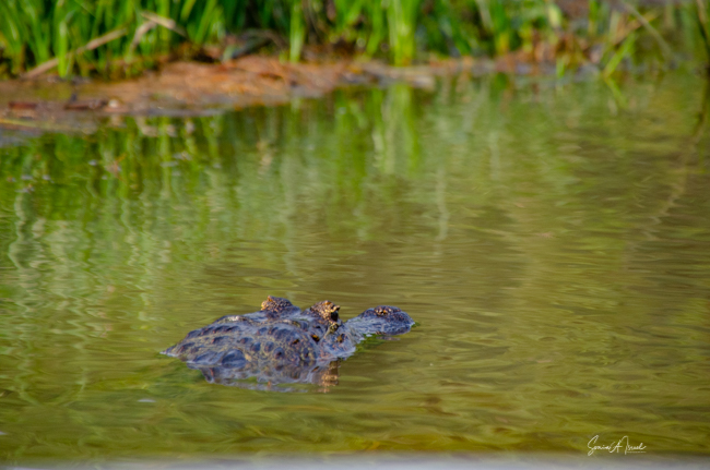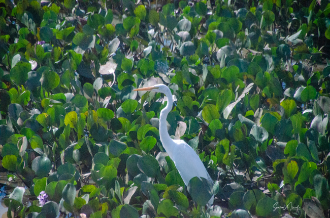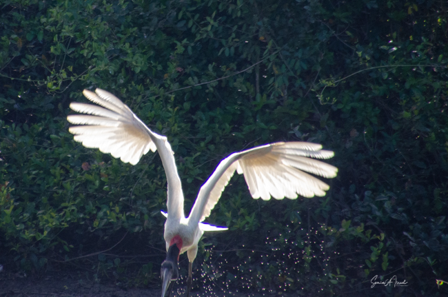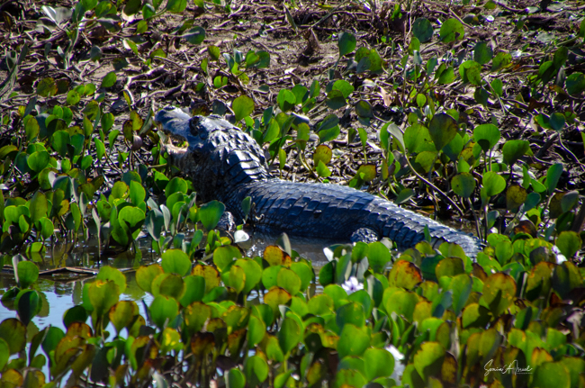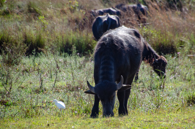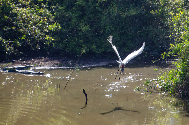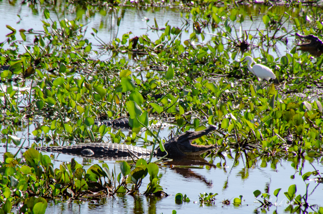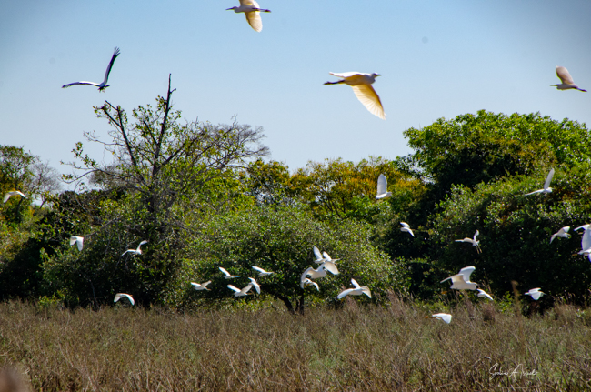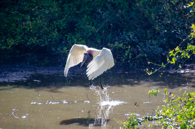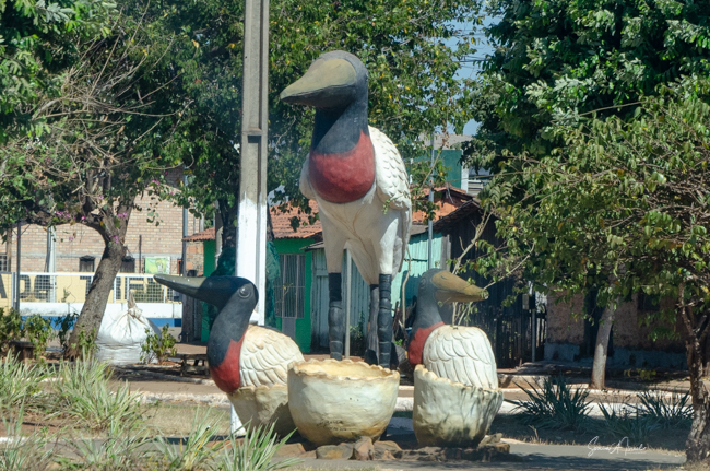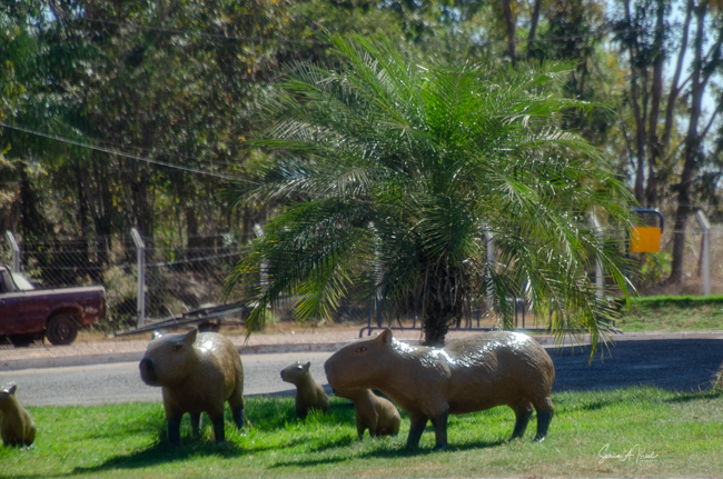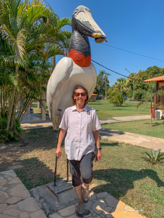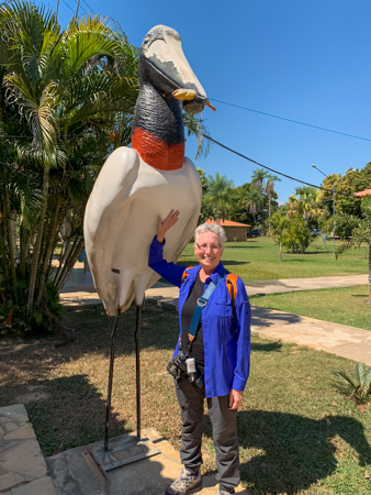 And we were so lucky. The rest of the group had arrived at night, so they didn’t get to see much. But I got to see so many things. We passed lots of statues of the local animals. Jaguars. jabirus, hyacinth macaws, giant otters, capybaras, caimans (see below to learn more about all of these). All the animals who are native here. And everyone seemed to want statues of them. (As an aside, once I returned home, I tried to find a statue of the Jabiru for my backyard. No such luck). But we also saw the real things. We passed a group of capybara in the water. We passed a Jabiru up in its nest. We saw a huge caiman who looked almost like a statue as he never moved the entire time we watched him. We saw Brahmin cows who looked so skinny and bony. We saw birds perched and birds flying. There was a green Ibis. There were cattle egrets sitting on top of buffalo. There was a kingfisher sitting on a wire. Muscovy ducks. Snail kite (a kind of hawk who hovers like a kite).