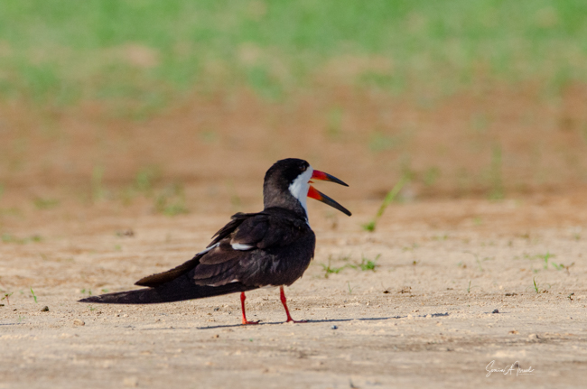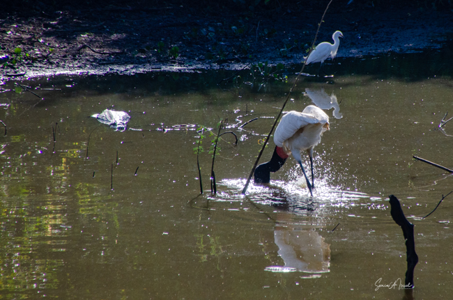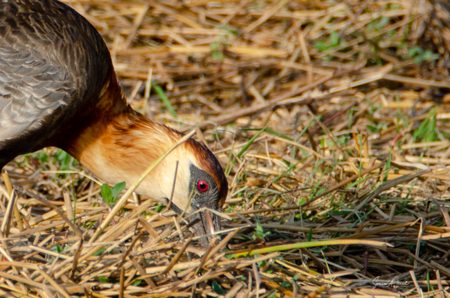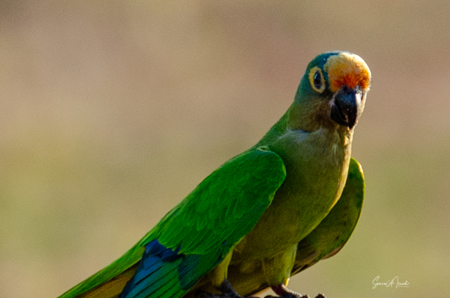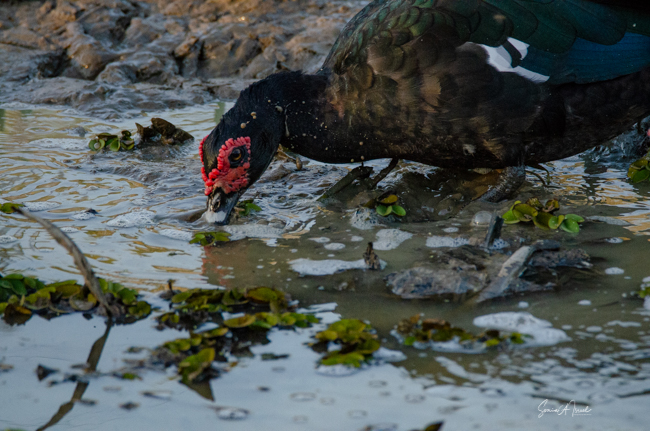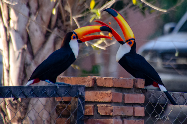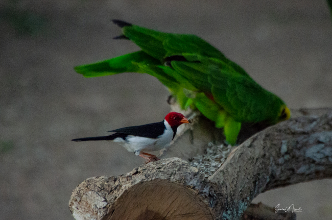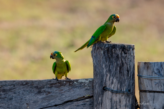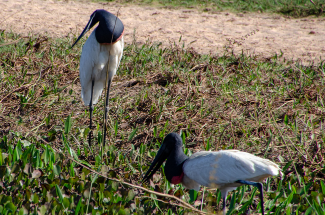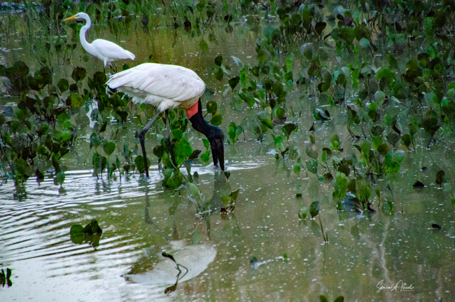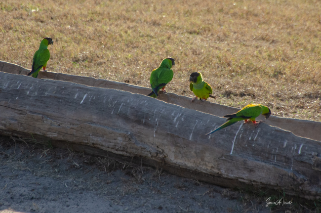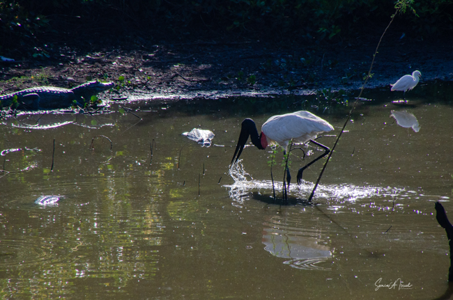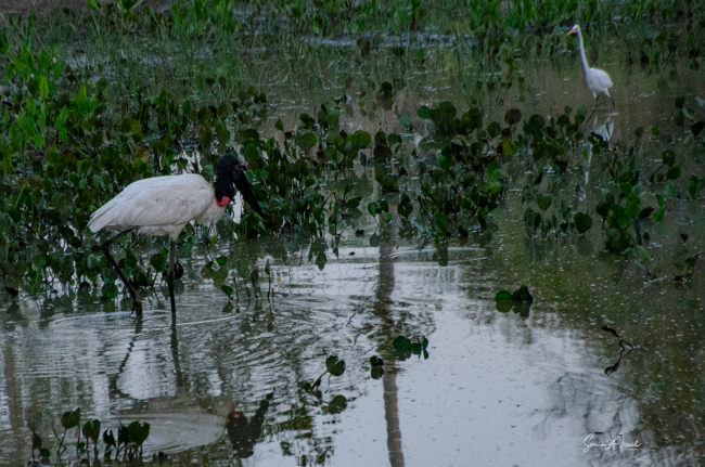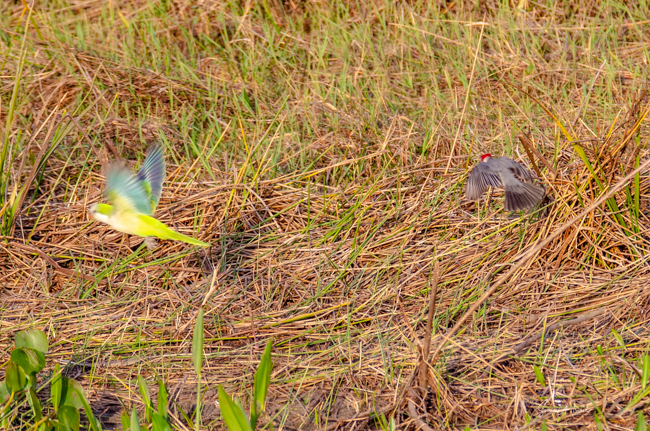 As we left our lodge, there were some gorgeous Vermillion flycatchers sitting on the fence posts, the same spot we usually see the owls. They return to the same places and use the same paths. We passed a marsh and watched some jabiru fishing, digging into the mud to find some worms. We passed the center where we had enjoyed our Pantaneiros breakfast and dinner, but this time, instead of cattle standing at the troughs, there were peach fronted parakeets perched one alongside the other.