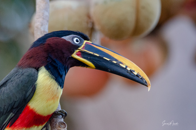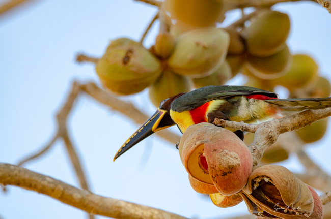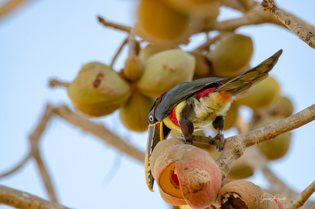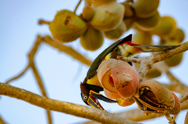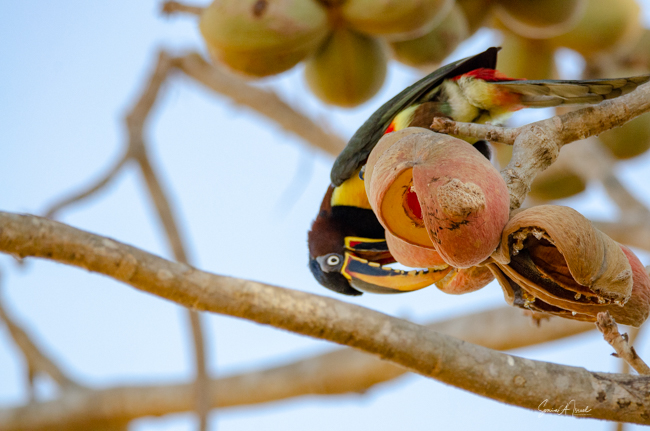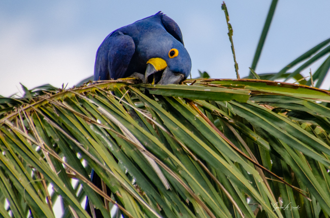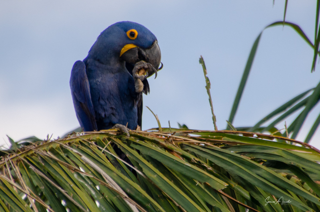 In the Pantanal, hyacinth macaws eat mostly nuts and little coconuts from the acrui and boucaiuva palm trees. They feed on the clusters that fall down from the tree or pick up the ones that have fallen on the ground. And they are extremely messy eaters. I can attest to that as we saw many of them eating, using their toes to hold the food. But by dropping the seeds they help regenerate forest growth. These birds are able to break open and consume the toughest nuts; their mobile beaks allow the birds to press hard seeds between their tongue and palate and grind them so that they can be digested. (For more on how they eat, please see the section below on the Southern Pantanal).