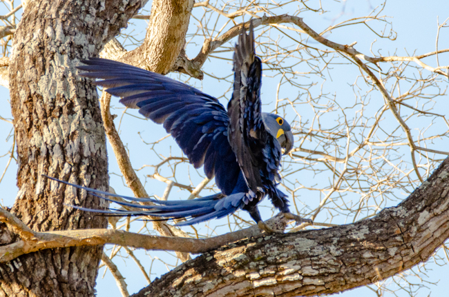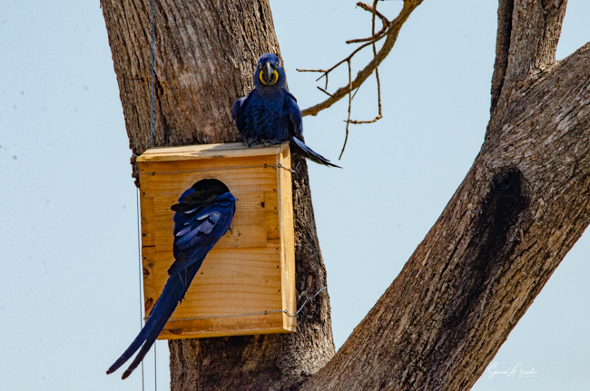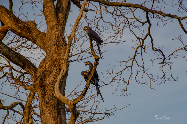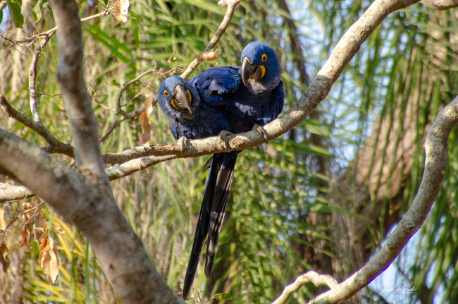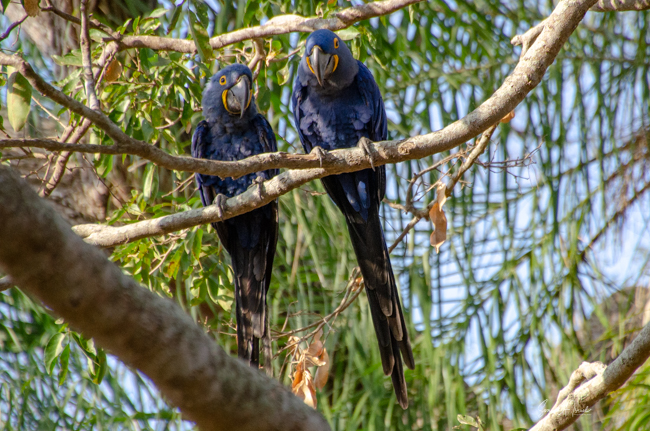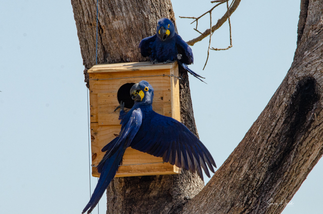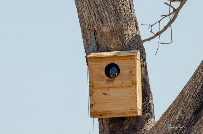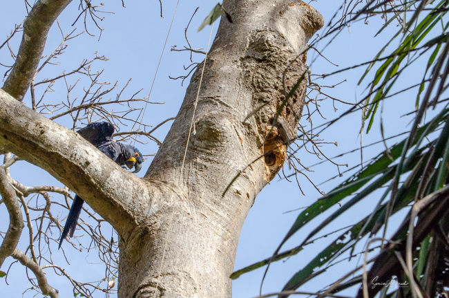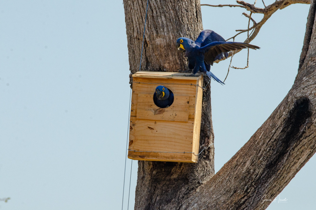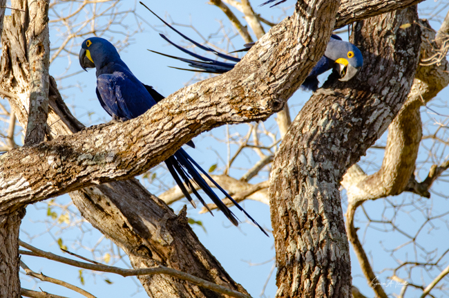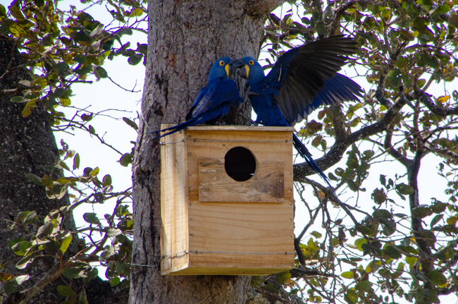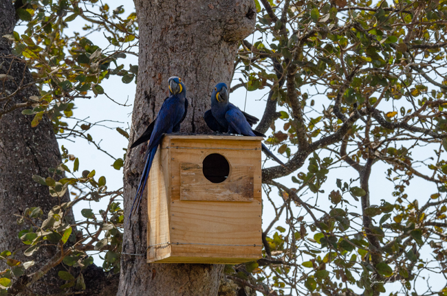 The hyacinth macaw population got so low in the 1980s that they were almost endangered. There are a number of conservation efforts around the country (see below for the conservation efforts in the Southern Pantanal at the Caiman Ecological Refuge), but the owners of this lodge have planted many trees that will eventually serve as homes for the birds. This will take time as the macaws build their nests on the manduvi tree and the tree has to be 60-80 years old to have hollows wide enough to hold the birds and the nest. But as the tree continues to age, it becomes fragile and vulnerable to the heavy winds during the rainy season.
