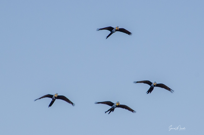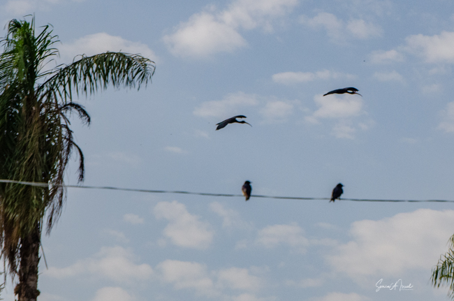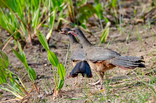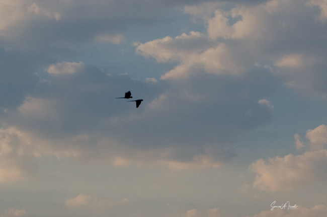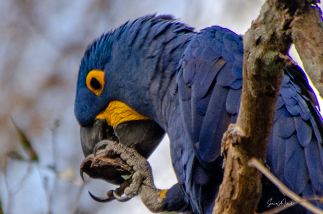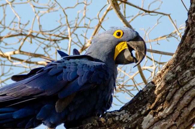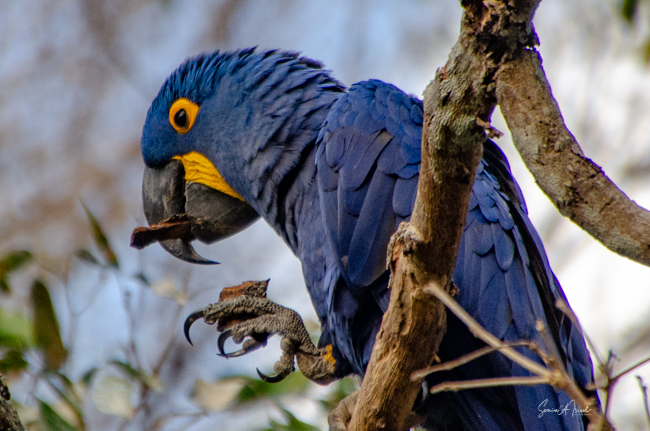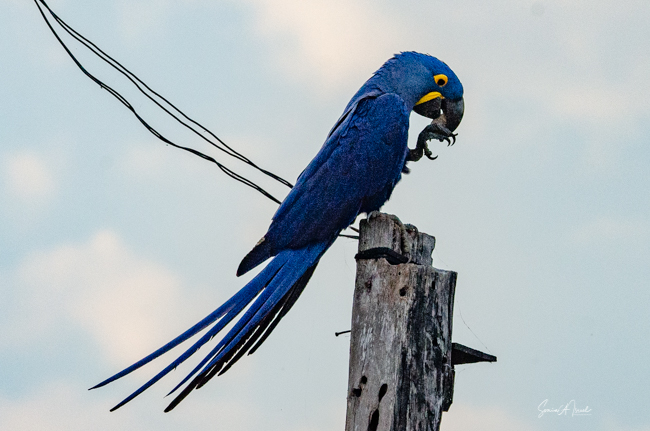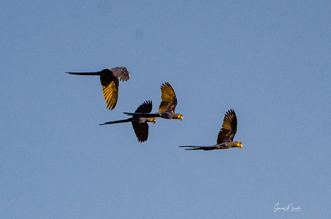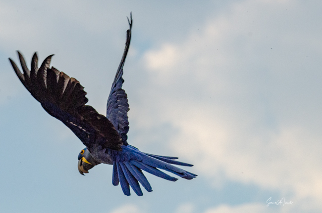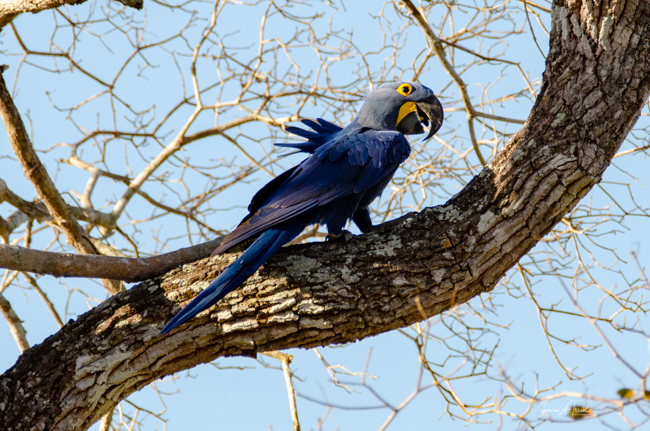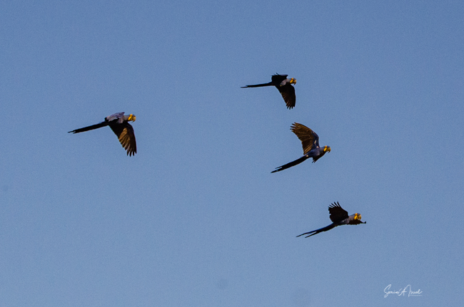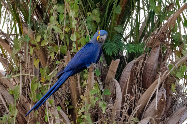 The hyacinth macaws, the largest of all the macaws, are all over the Pantanal, living in tall trees, in palms in the swamps, in the forests and near rivers, flying everywhere, and even walking on the ground. As the name suggests, they are a bright blue with large black eyes surrounding by yellow rings, a yellow chin and a strongly hooked beak. Their feet are zygodactylous which means that two toes point forward, while the other two point backward. They are the largest of all the parrots with an average wingspan of four feet. Their long beautiful tail comprises about one-third to one-half of their length.