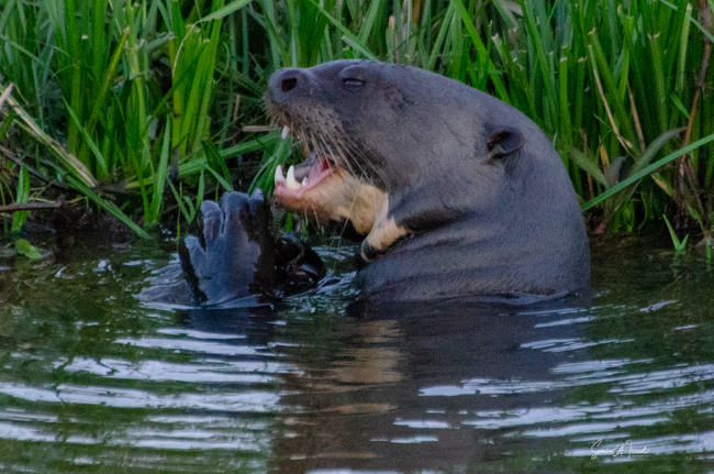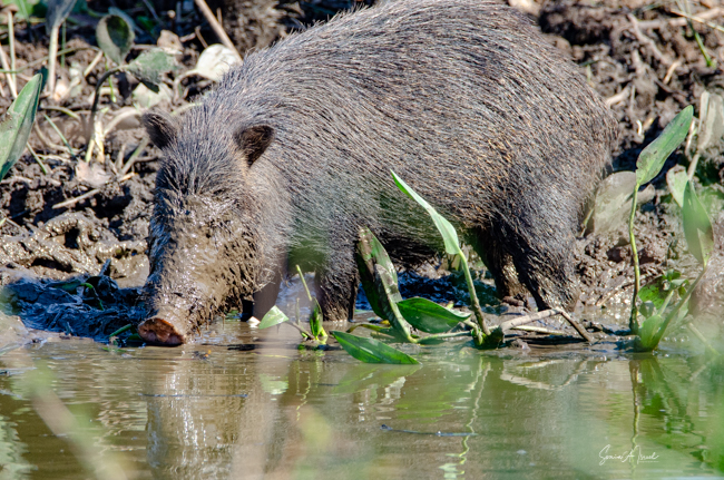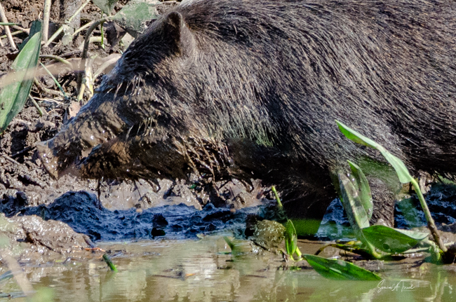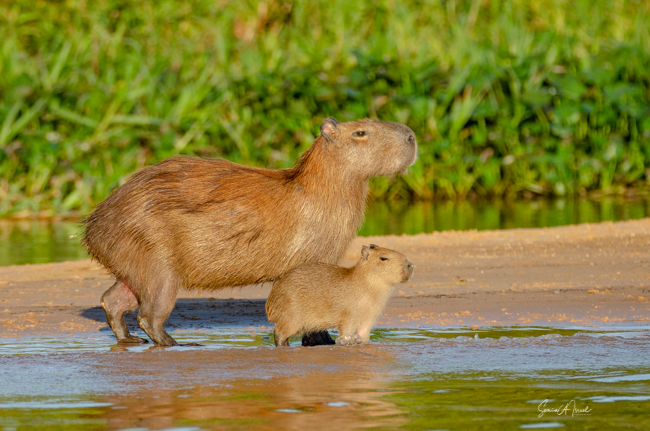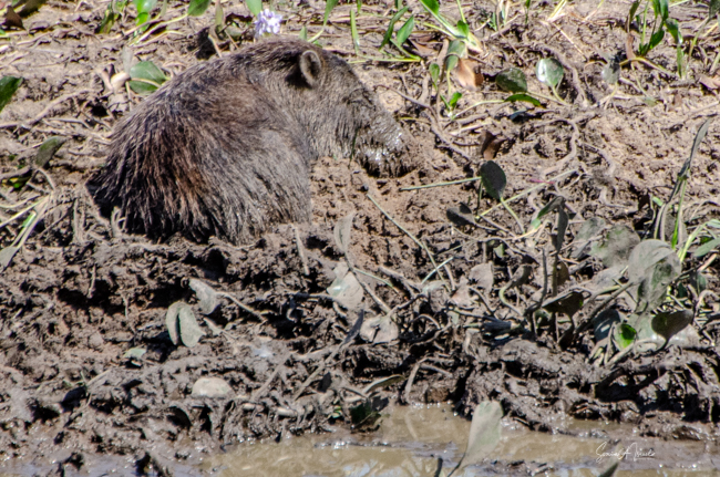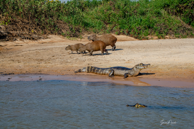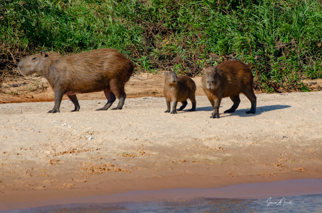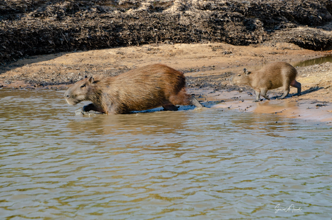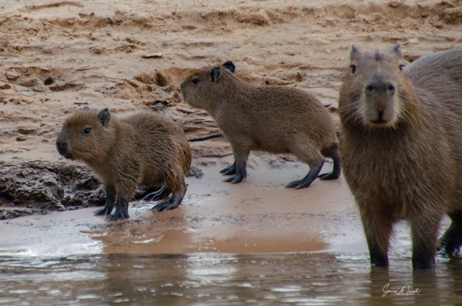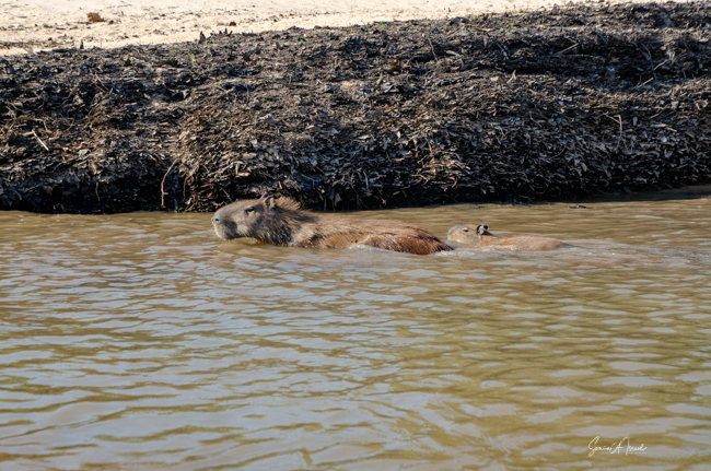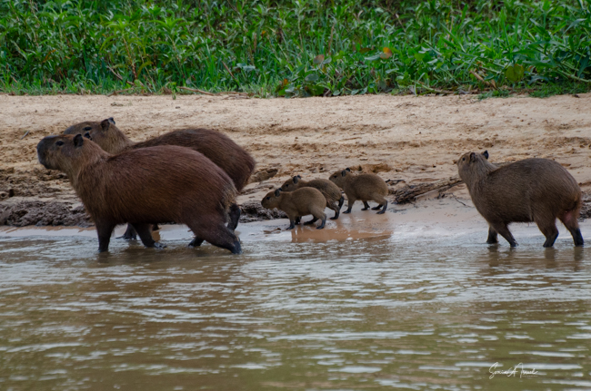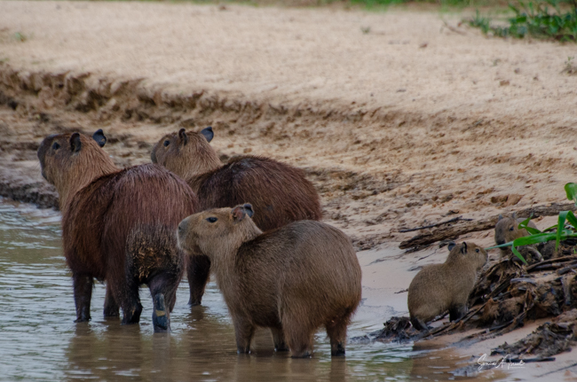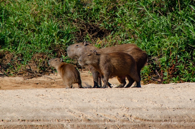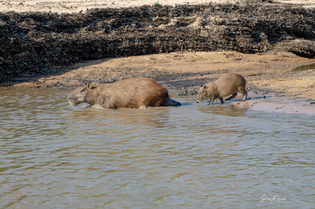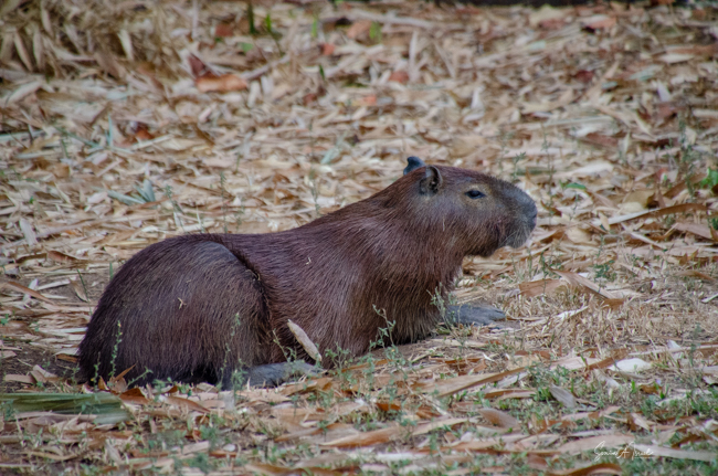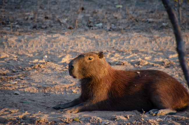 The capybara is the world’s largest rodent and is a relative of the agouti, chinchilla, and guinea pig. They are semi-aquatic mammals who like to live in densely forested areas but always near bodies of water, i.e., the Pantanal. Their scientific name, hydrochaeris, comes from the Greek meaning “water hog.” The name capybara comes from the word, kapiyva in the Guarani language, meaning “master of the grasses,” also translated as “lord of the fields.” Zapa told us that “they live to live.”