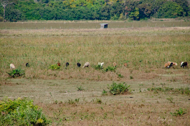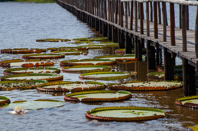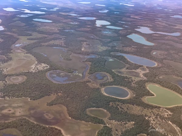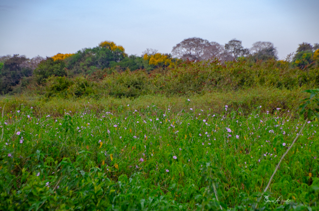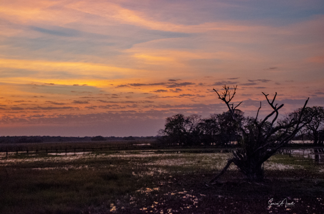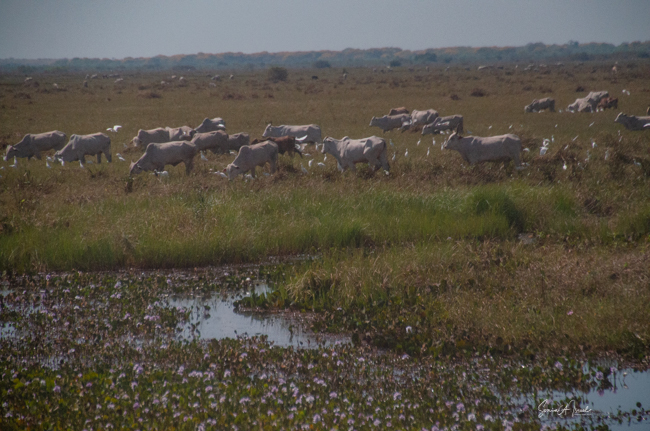 And of those seven biomes, the Pantanal has elements of five of them – the Cerrado, the Amazon, the Atlantic forests, the Paraguayan Chaco, and Caatinga. The Pantanal area is characterized by a top layer of sandy soil over clay. It is not good for agriculture so the farms that do exist are mostly cattle farms. When it rains, the rains descend in a torrent but do not permeate into the ground, so flooding is widespread and deep. Since this area is very flat, the water from the rivers rise and combine with the waters of the lakes, creeks, and marshes and all of them then merge with the Rio Paraguay to form one large fresh water sea. When the water recedes, the land is renewed and fertilized.