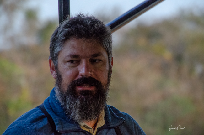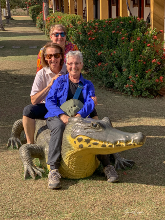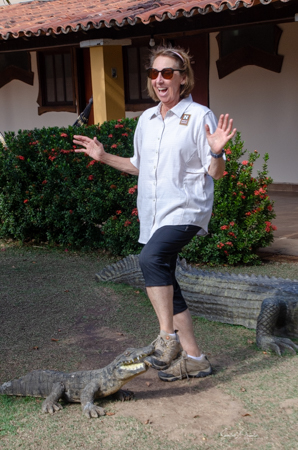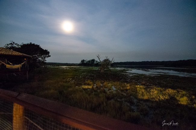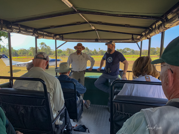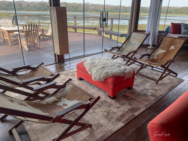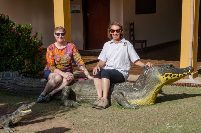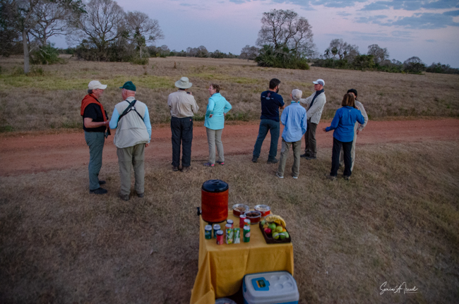 And that was just the morning. We went back to the lodge for lunch and a brief rest. Then we gathered in our living room for a lecture by a biologist, Stephanie, who works for the Oncafari (meaning Jaguar Species as “onca” in Portuguese means jaguar). The project began in August of 2011 to promote environmental conservation and foster the socioeconomic development through ecotourism and scientific studies. In Southern Brazil there are no longer any jaguars. In the Brazilian Savanah the jaguars are endangered. In the Pantanal and Amazon, which are geographically connected, the jaguars are only vulnerable, not endangered. So the Oncafari’s goal in the Pantanal is to protect jaguars. In this way they preserve the species, which includes the whole food chain, so in fact they are preserving the Pantanal. This also helps create jobs for men and women and increases the value of the land.