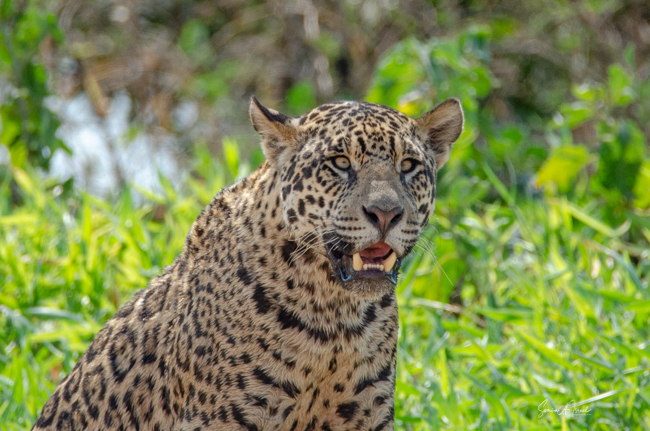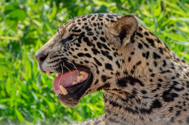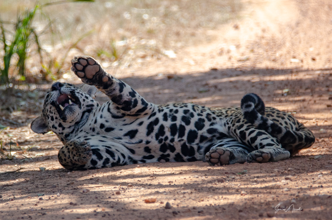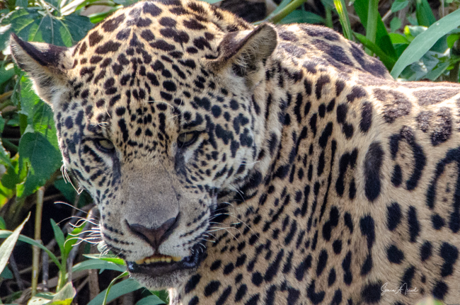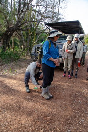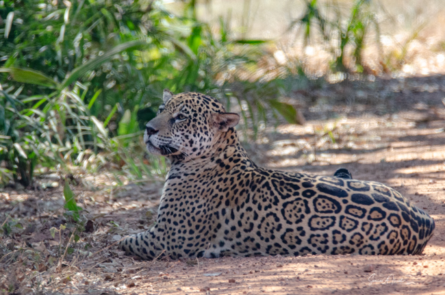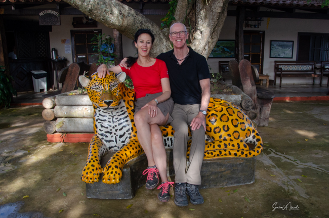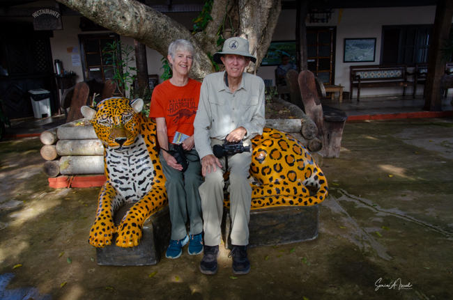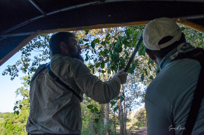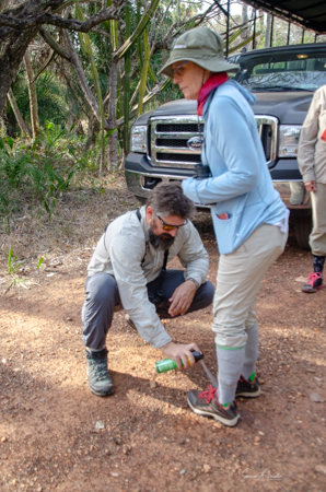 We asked Stephanie how they get the collar on the jaguar. She carefully explained that they use a lasso cage which captures the jaguar on its leg. The trap has a transmitter and the staff frequently checks if the trap is activated. That way the jaguar is not left there for long. They quickly drive over and use a dart to put the jaguar to sleep. They collect blood, look for disease and parasites, measure everything on the animal, check teeth for age (they do this with puma, so are researching if same way works with jaguars) and then put on the collar. They have a whole team, so everyone has a job and it all moves quickly. And they do it all right on the pickup truck. Once the cat begins to wake up, they put the cat back in a safe spot. It will take a few hours for the cat to wake up fully. They never leave them in the sun, in water or on the road. And they think that the jaguars don’t seem to remember the events.