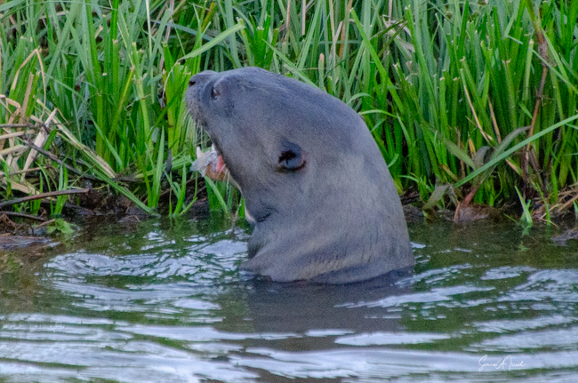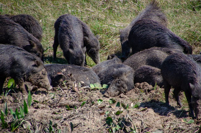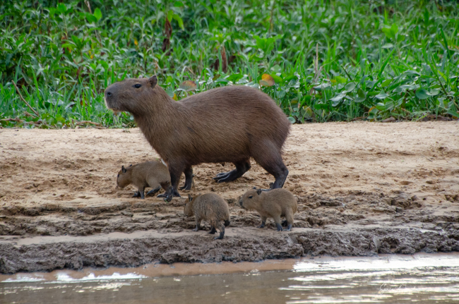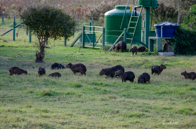 Baby capybara begin eating grass within a week of being born but will continue to suckle—from any female in the group—until weaned. Youngsters will form their own cluster within the main group. We saw lots of little ones, and while I am not a rodent fan, these were very cute.