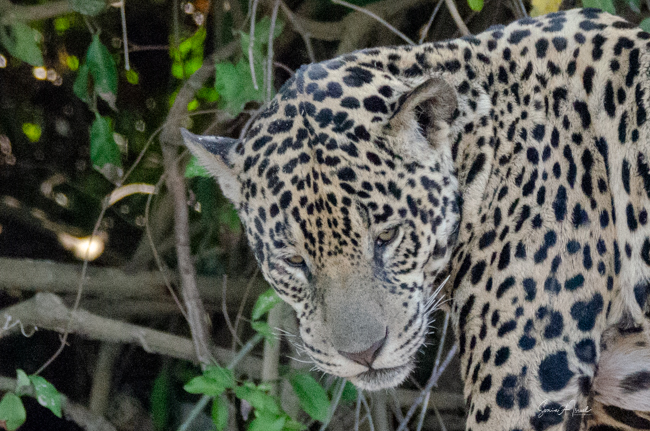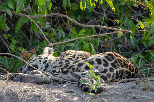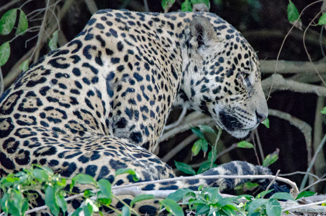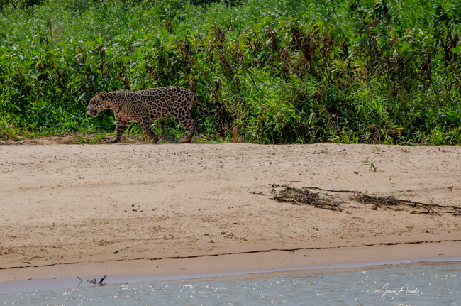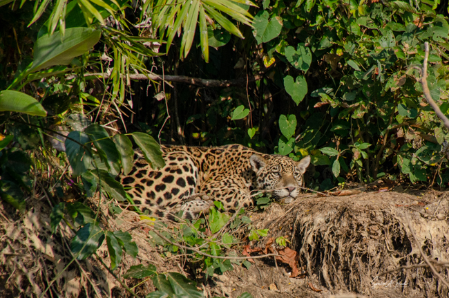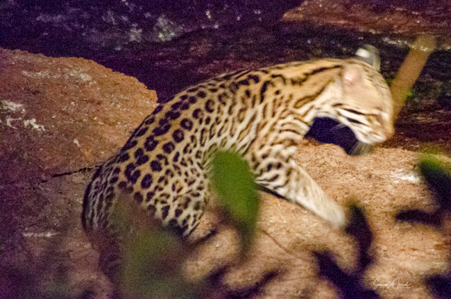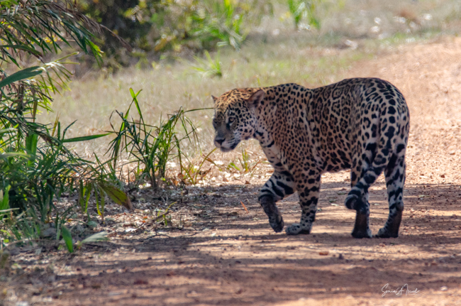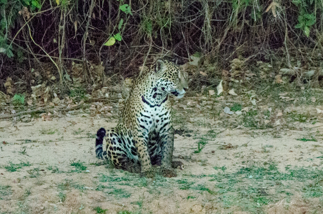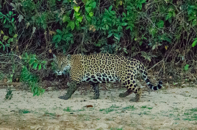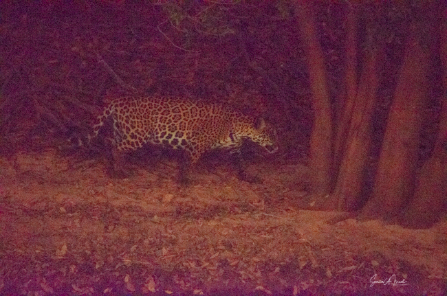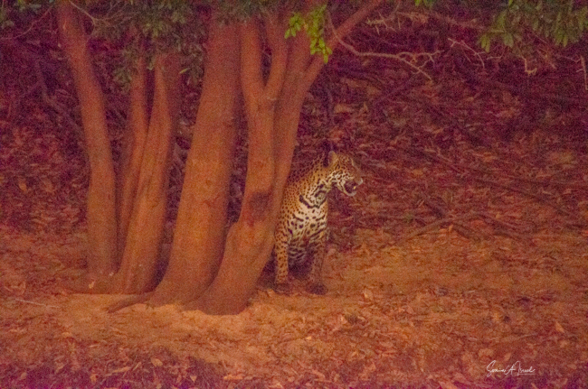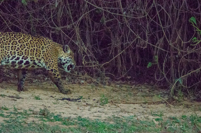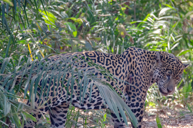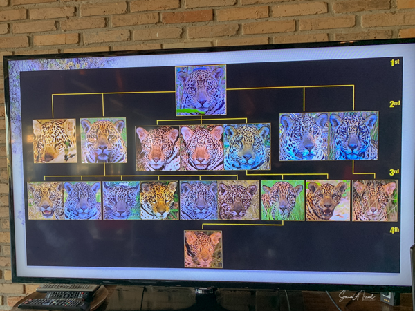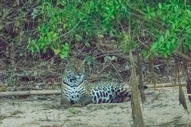 Many jaguars have been identified here, and as I mentioned above, they are recognized by their facial roses (spots). Seven out of 50 on the property, wear radio collars. But in all, 140 different jaguars have been recorded. Some visit from other places. The recordings occur on 80 cameras placed around the 240 square miles owned by the Caiman Lodge. Since the jaguar is often nocturnal, infrared lights are used so you can see the behaviors on the video.