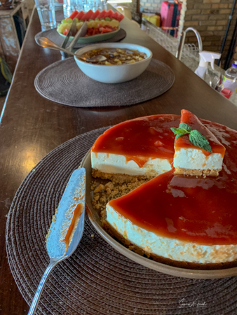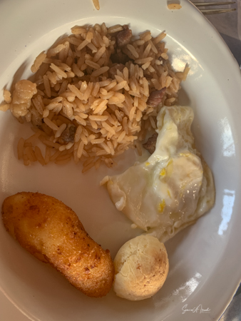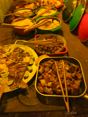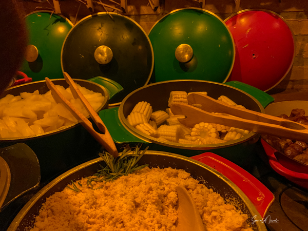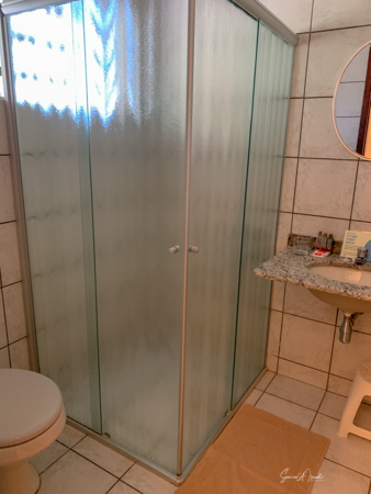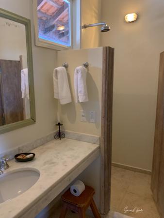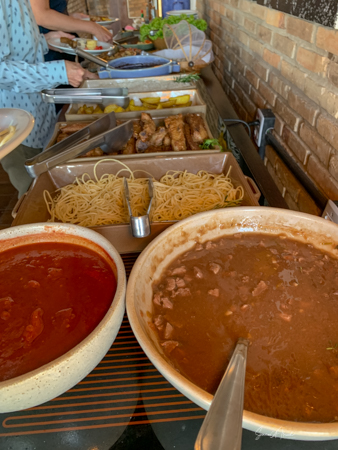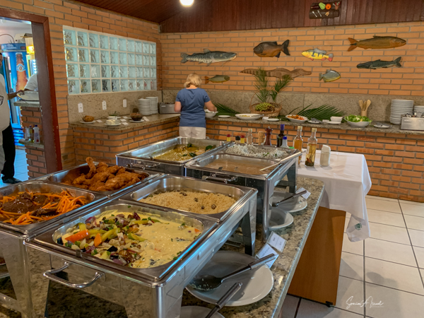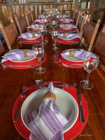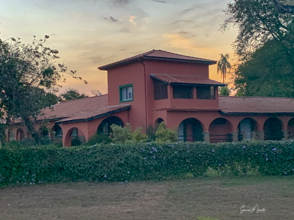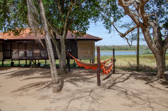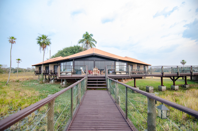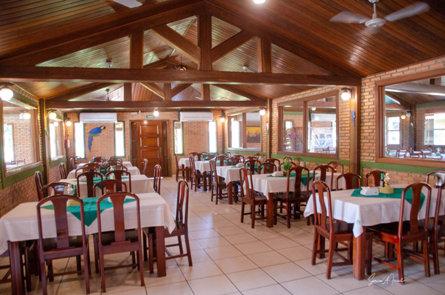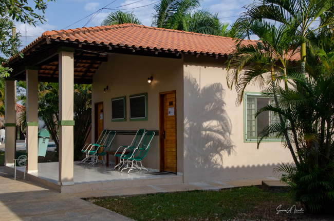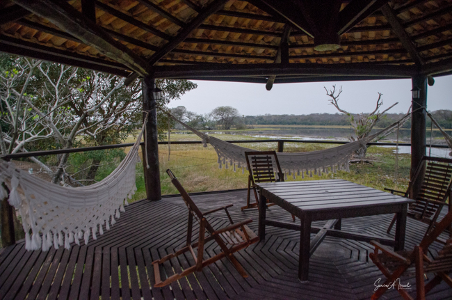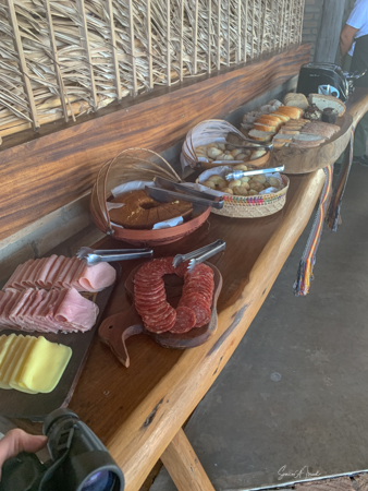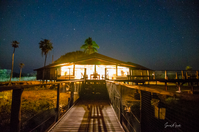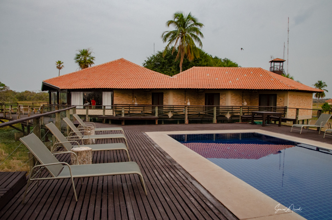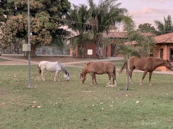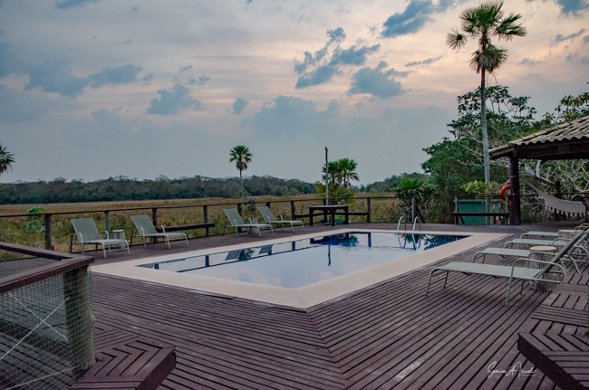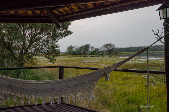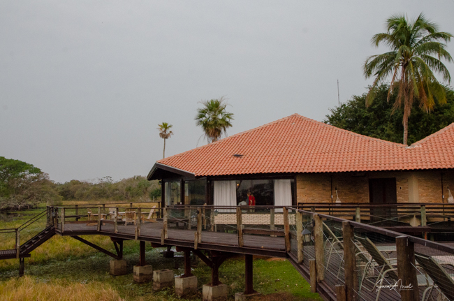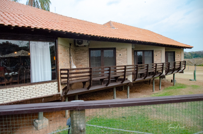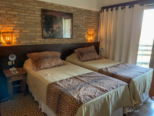 Araras Pantanal Eco Lodge, which was one of the the first eco-lodges in the Pantanal, was built to be in perfect harmony with the beautiful surroundings. It is a self-sustainable lodge with its own private trails in the forest, wooden walkways over the wet areas and lots of birds. There is also a swimming pool. They offer guides and canoeing and horseback and safaris, but we had our own and didn’t need to use theirs. Breakfast, lunch, afternoon tea and dinner were all included, but I only got to enjoy dinner and breakfast. Dinner was in the large wooden dining room which was set with long tables and round tables for group meals which were served buffet style. Breakfast the next morning was outdoors surrounded by the trees and birds serenading us. All the food is local with the fish from the nearby river, the beef from a ranch close by, and the fruits and vegetables all grown locally. The décor is rustic but in a comfortable way, made from organic materials. Our room was very simple with two beds, some shelves and a small, but adequate bathroom.