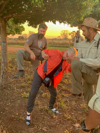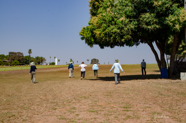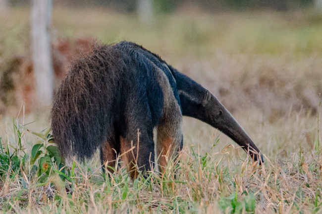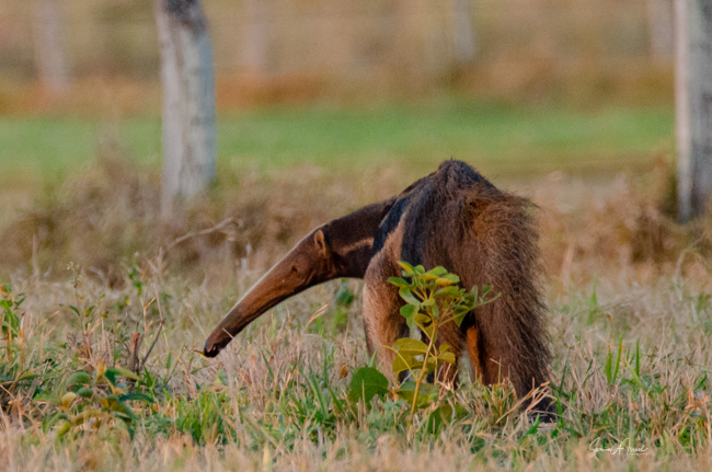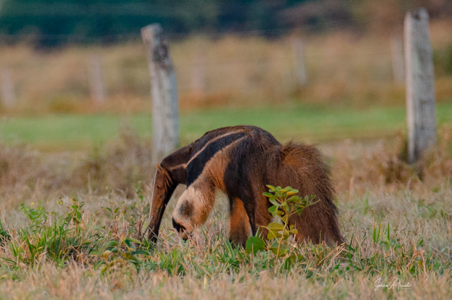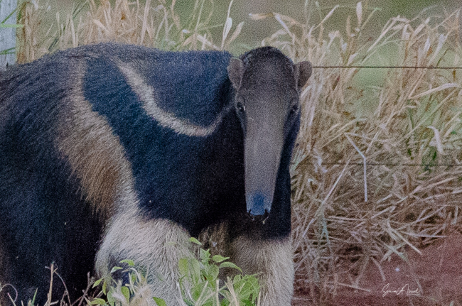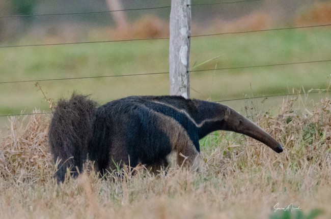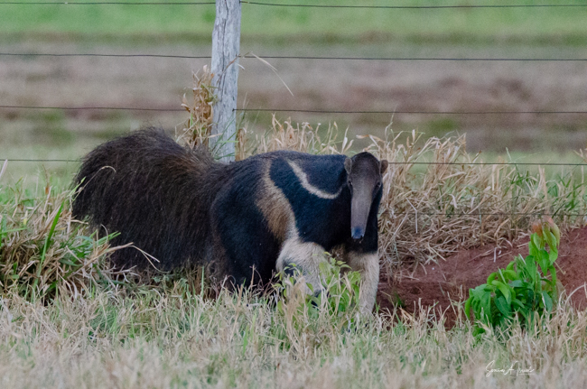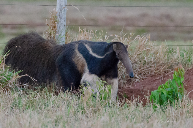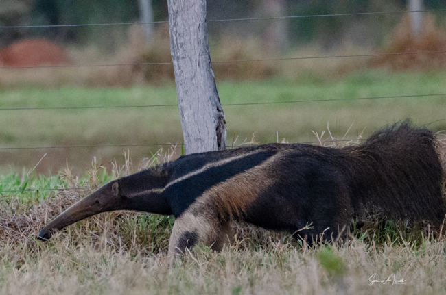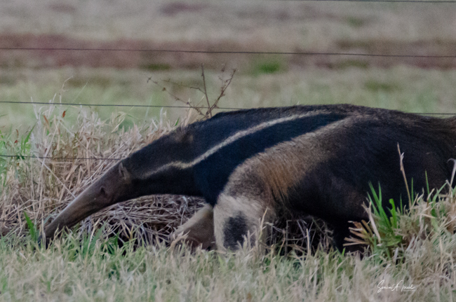 And then, although our last day, it was once again a lucky day when we saw not one but two giant anteaters, also out in the late daylight. We watched from the truck, but then Zapa said, “Everyone out! We’re going in!” The anteater closest to us was just a bit far, so Zapa decided we would follow him, on foot. He pulled apart the fence wires so we could climb over and walk on the field to get closer to the anteater.