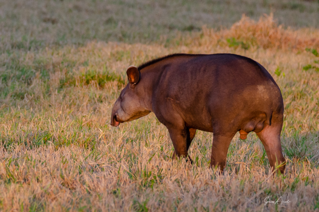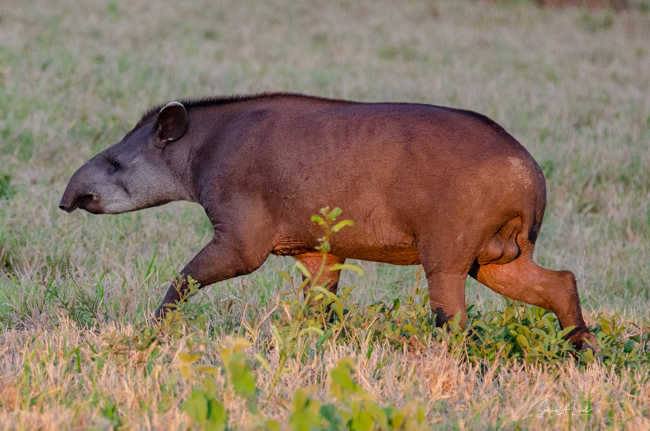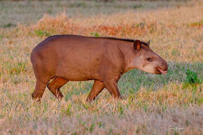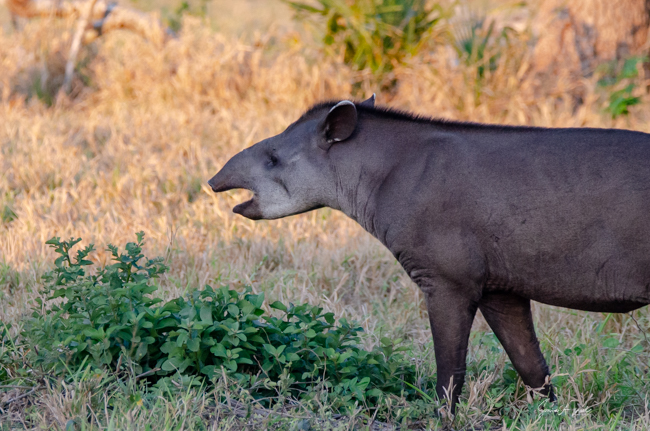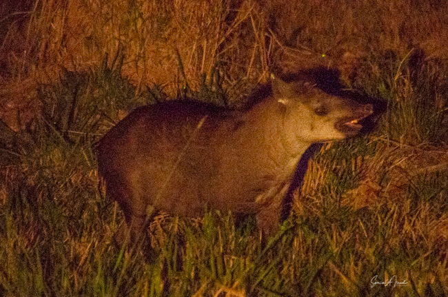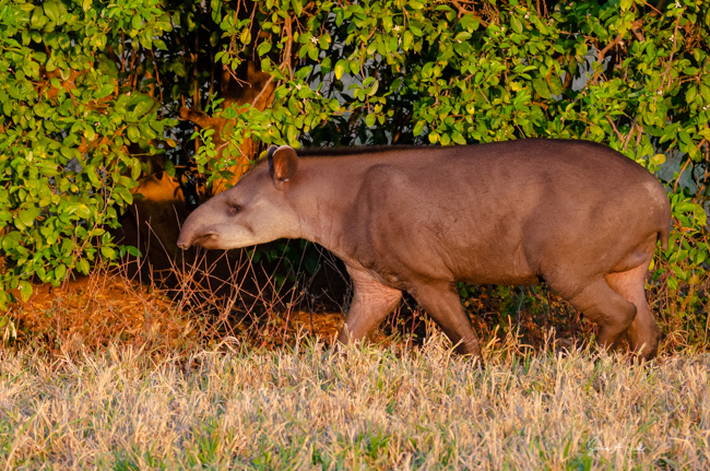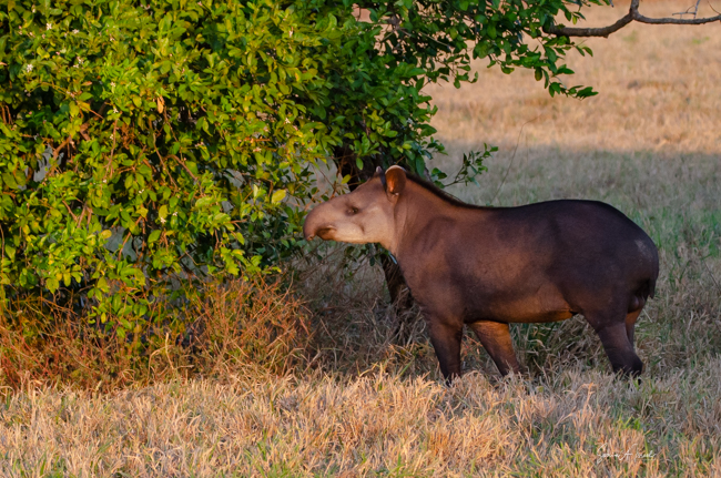 As the sun began to lower towards the horizon Zapa suddenly yelled out, “Hold on tight” and Guanara floored the accelerator, the safari truck sped at top speed, around curves, down the road. We held on in amazement, laughing. Why were we racing so ecstatically? On the other side of this park, there was a tapir. In daylight, where we could easily watch him and take pictures. The lighting was perfect, with the sun turning the tapir a golden color. A photographer’s dream. And Zapa did his happy dance right in the truck.