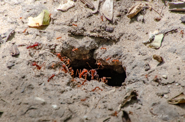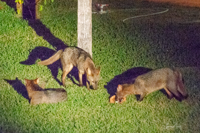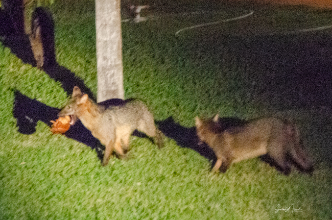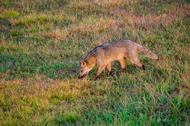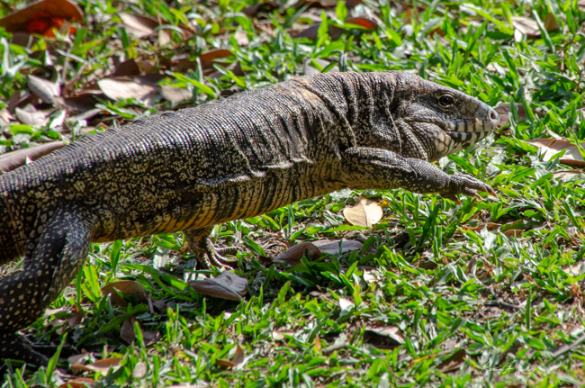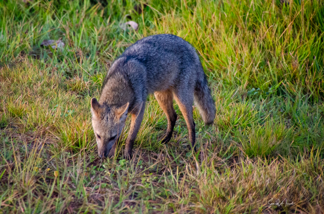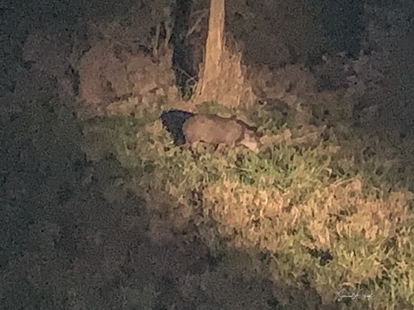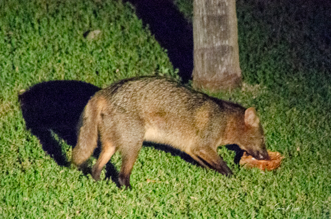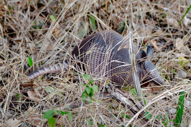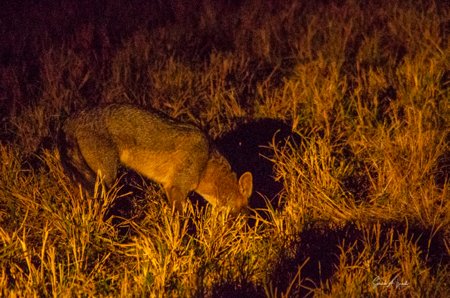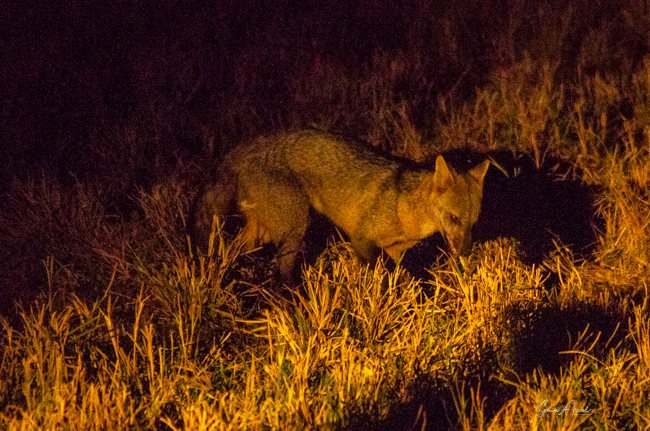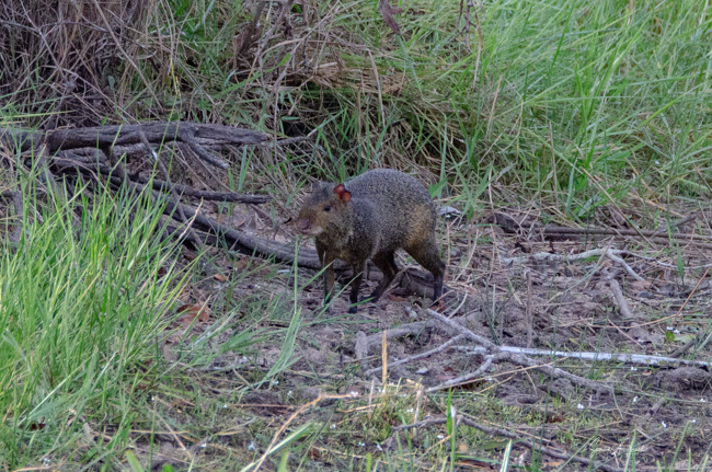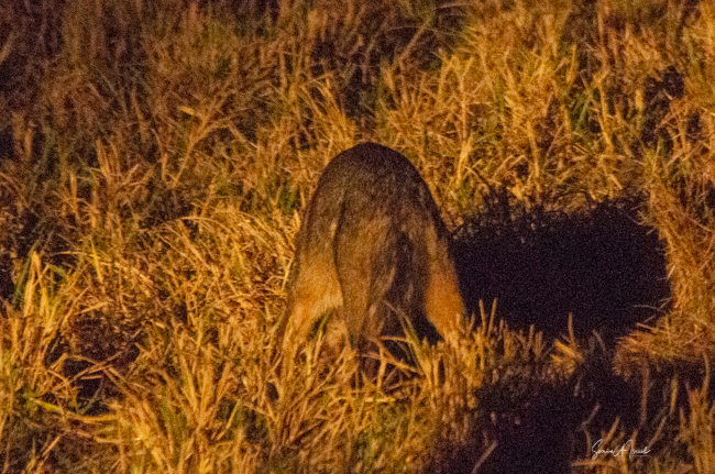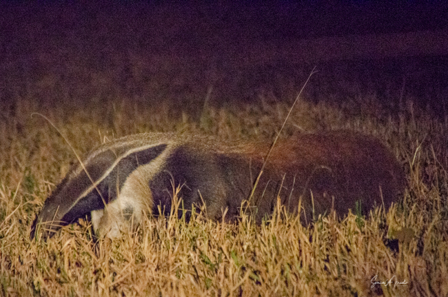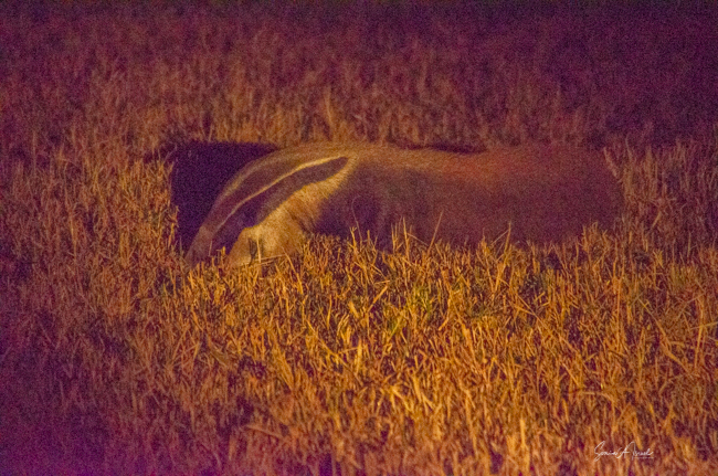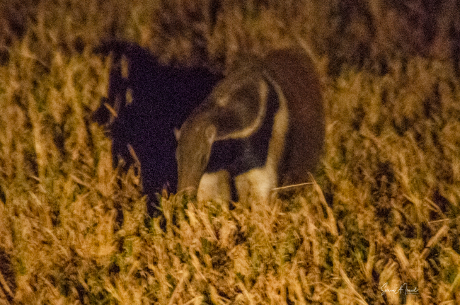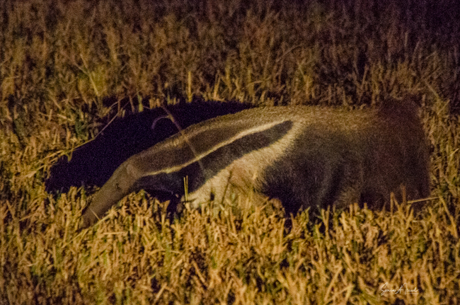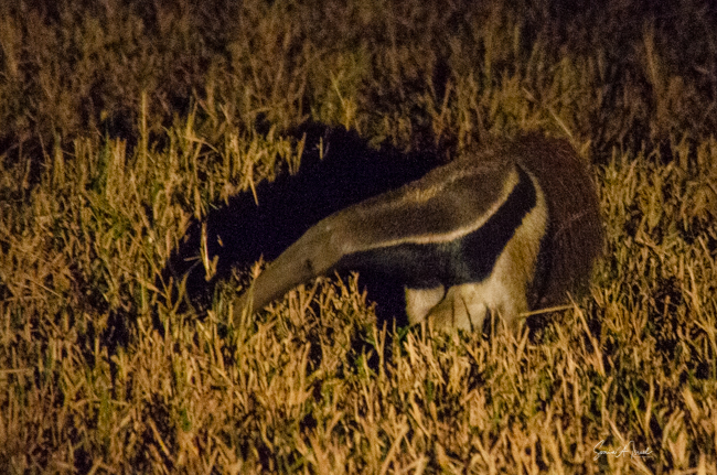 I described the giant anteaters above, but seeing this one in the light made me realize just how strange looking they really are. His tail was so bushy and his nose so long. And with the white stripe, it was sometimes hard to tell his head from this leg. He walked along, sticking his nose everywhere to find and slurp up ants and termites. Anteaters have terrible eyesight so we were able to get much closer to it. That is, until it caught wind of our smells and wandered off.