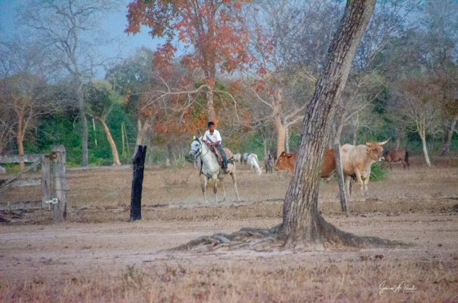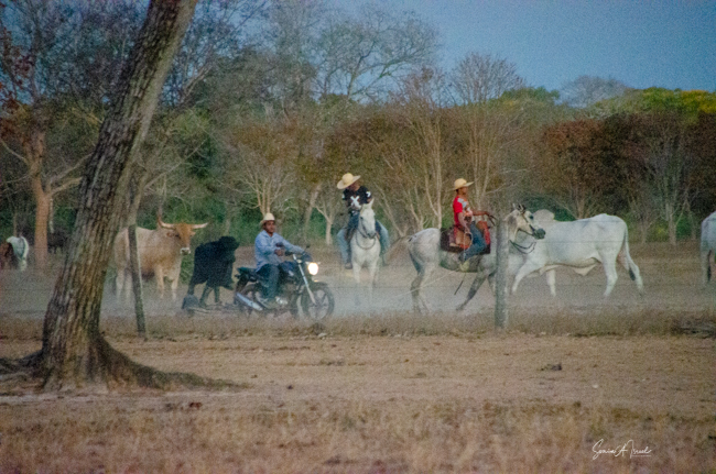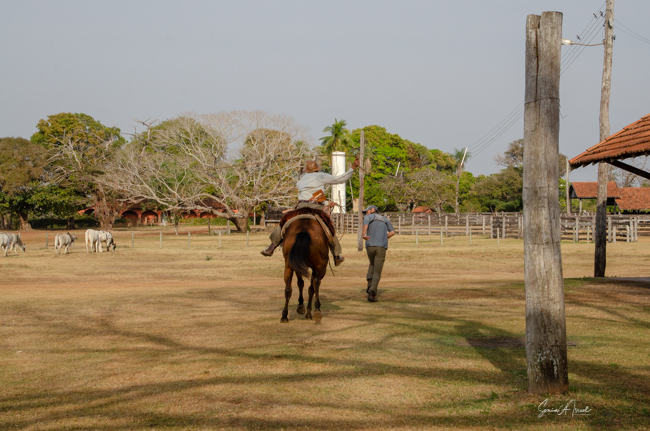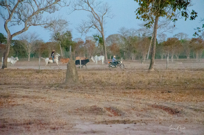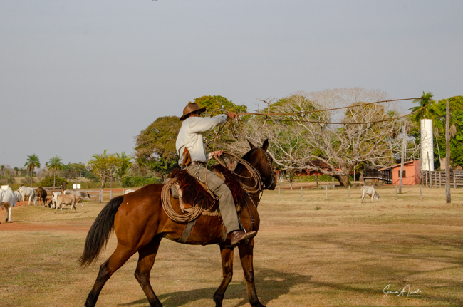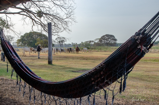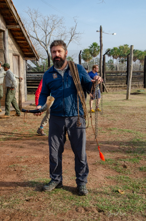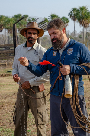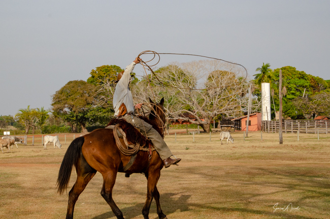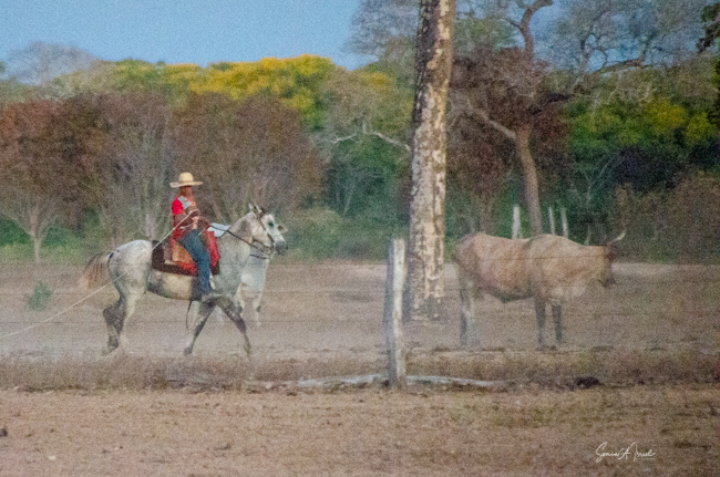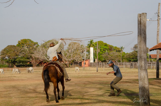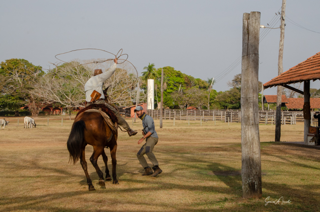 At the other end of the ranch were cowboys, Pantaneiros, learning how to lasso the cattle, both for their ranch work and for competitions. There was a man riding a motorcycle pulling a fake bull. The Pantaneiro would ride his horse behind, trying to lasso the “bull.” The experienced cowboy would lasso the horns of the bull, and nowhere else. Chaco, Zapa’s local helper guide in the north, was a Pantaneiro as was Guarano, Zapa’s local helper guide in the south.