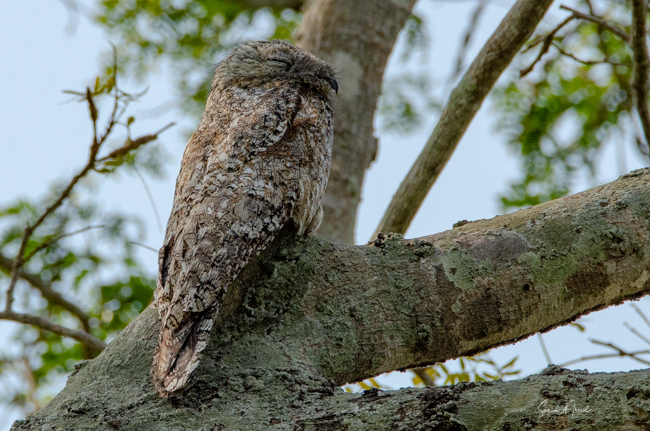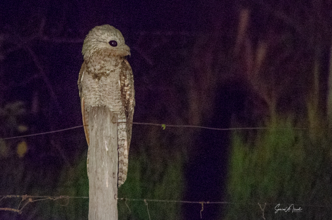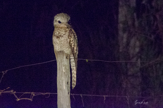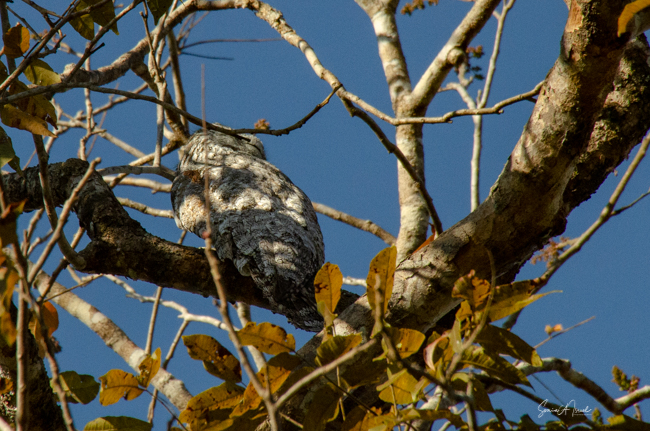 The great potoo (Nyctibius grandis) is a nocturnal passerine bird (meaning it has feet adapted for perching). Its most well-known characteristic is its unique moaning growl that it vocalizes throughout the night. We did not get to hear that.