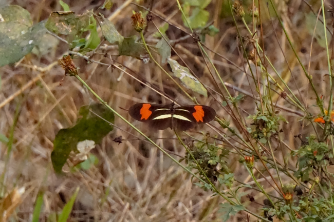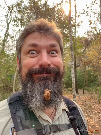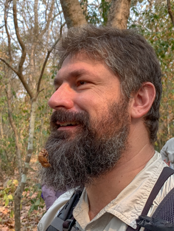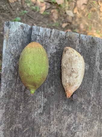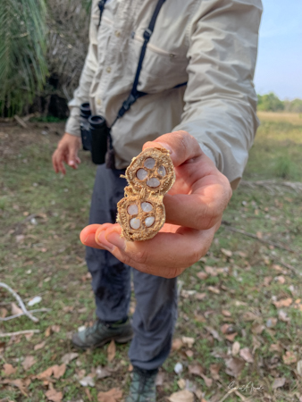 They then walked into a dry forest. The trees were much taller here, the wood is generally a hardwood and the forest is generally much drier. They saw a number of different butterflies, including a black one with orange patches, a gorgeous blue one and some yellow ones (I think their names were Julia butterfly, Viceroy and Morfit). There was a pile of white feathers where a hawk had eaten a great egret. Circle of life. They saw a family of Aotus azarai and Capuchin monkeys, which we had not seen before. There was a young one that was lost but the mom came back to retrieve it. They jump from tree to tree. They also saw a blue kingfisher and a toucan. Then they entered a Savannah woodland. Ruthie said she could not tell the difference. There were no macaw nests here. The area is wetter and more resembles the Amazon. Zapa noted that in the Southern Hemisphere, vines go clockwise up trees. They found a cicada body shell which Zapa put in his beard.