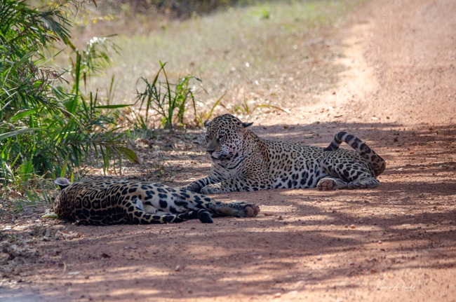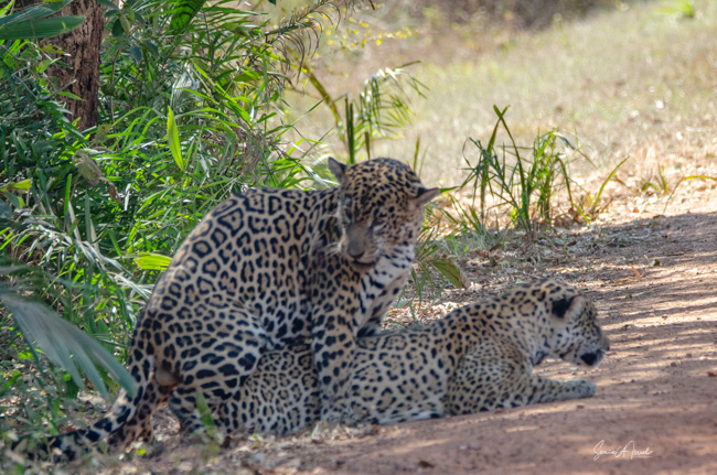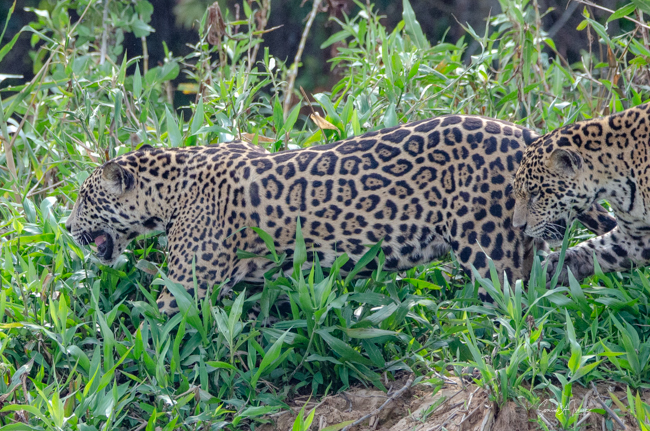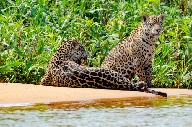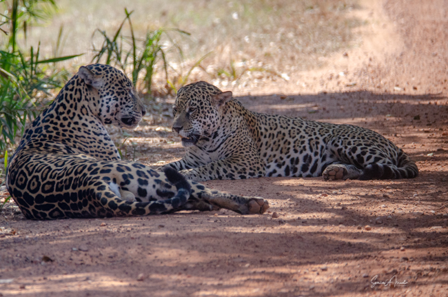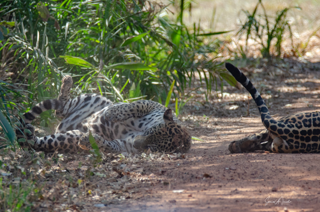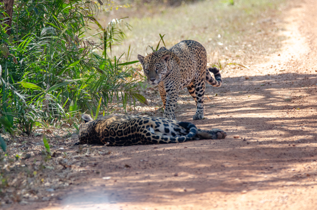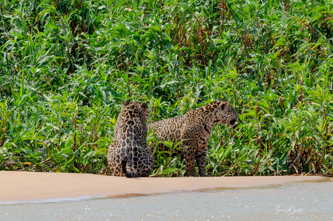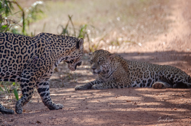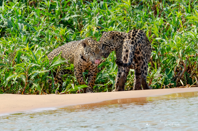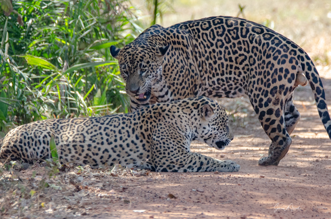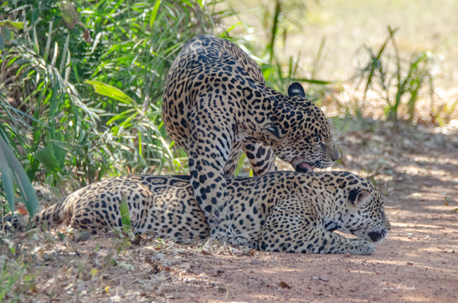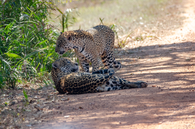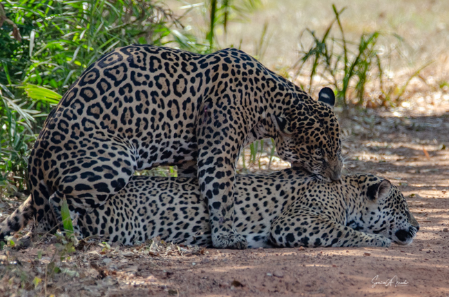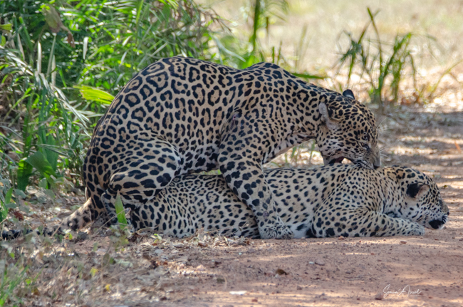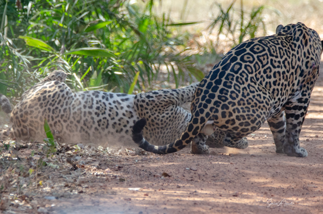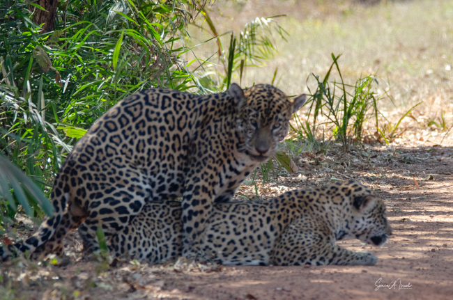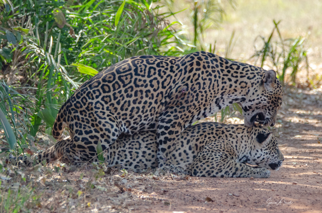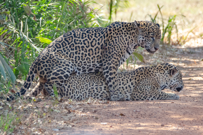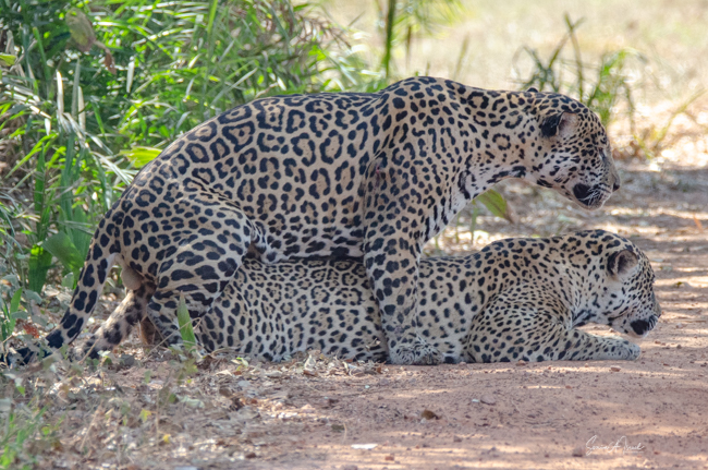 year during the rainy months of April and May. The male pursues a female and mounts when she stops in water. Having said that, we were in the Pantanal during a full moon in August, and we saw them mating on land.