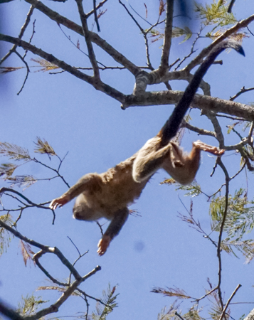 Their big predator is the jaguar. Later in the trip, we would see several jaguars stalking the capybaras. To protect themselves, the capybaras stand around in groups, with each one facing a different direction, on the look-out (you can see that in each of the videos). When they realize how close the jaguar might be, they communicate through a combination of scent and sound such as purrs, alarm barks, whistles, clicks, squeals, and grunts. They then jump into the water where they can stay underwater for up to five minutes.