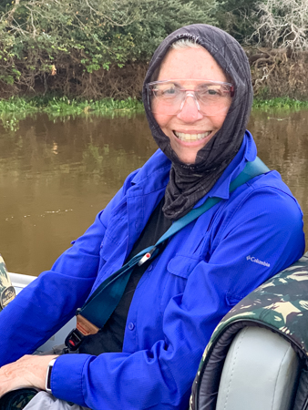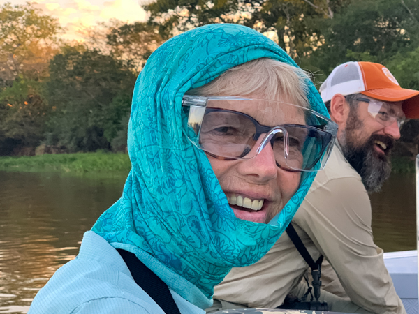 We were here in mid-August. The days were warm, especially on the river. A t-shirt with a long sleeve sun protection shirt was enough. But the early mornings and evenings as the sun was setting were quite chilly. Bring a warm hat along with a wide brim. A neck buff is a must, for sun protection (neck, ears etc), wind, warmth, water spray. We wore it all day long. Gloves. Fleece or down jacket. Glasses for the bugs when the boats are really moving. Nat Hab gave us clear ones.