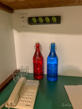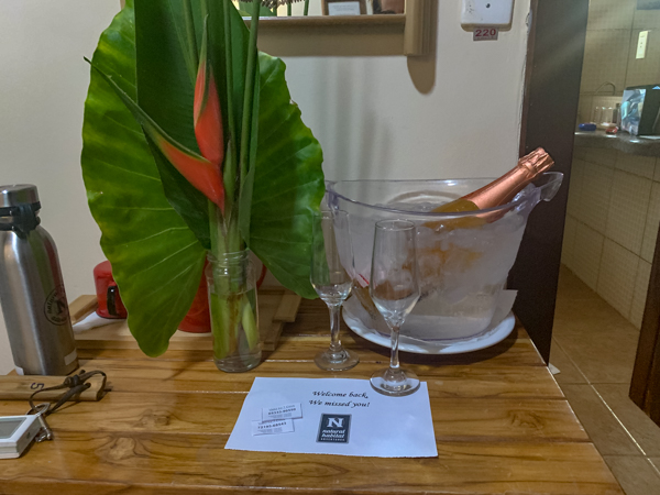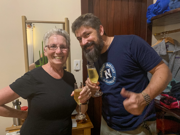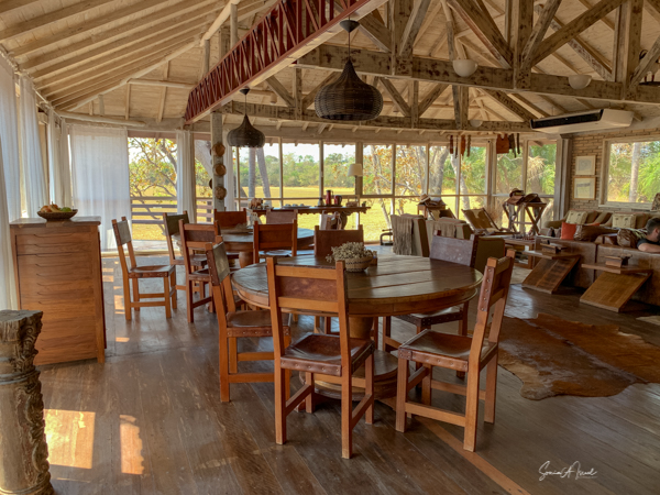 After a trip of about two hours covering 80 miles, we finally reached the Araras Pantanal Eco Lodge. We drove up and were greeted by a capybara, Zapa and Ruthi, a wet towel and a glass of Barbados berry juice. Andre Thuronyi (who is Hungarian) and Jerneja Akhila Krusic (who is Slovenian), the owners, also greeted me as they do each guest on arrival. Ruthi walked me to our room and there was a bottle of champagne on ice and some flowers, sent by Natural Habitat, to welcome me.