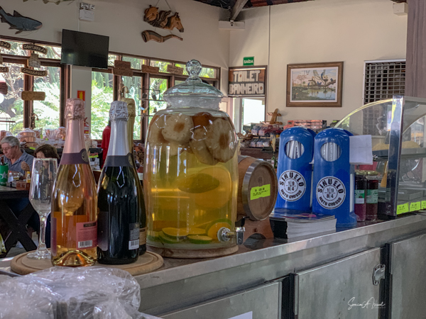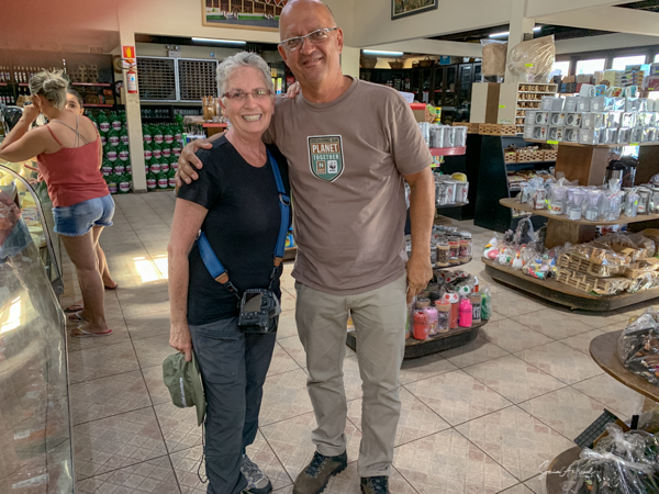 Eugenio Souza, my very own private Natural Habitat guide and I were met right outside of arrivals and the trip officially began. We stopped for lunch right in town at Sinuelo, a combination restaurant, take-out and souvenir shop. And I did buy some gifts there. Although there were lots of tables and chairs awaiting us, we decided to take our sandwiches to go in order to save time. I was anxious to rejoin the group. The menu looked great and we each chose our sandwiches. The waitstaff was busy in the kitchen but brought out glasses of homemade berry juice for us to try. It was delicious, as were the sandwiches. After a brief wait, we got our lunch and hit the road. We drove through small towns, many of which were shut tight as it was Sunday and this is a Catholic country. We did make a brief bathroom stop one hour into the trip at Pocone, a small town of 5000 people. I think its claim to fame is that it is on the route to the Pantanal. But it had a clean bathroom and a fancy restaurant/gift shop. I did notice when I stepped out of the car that the road was this red dirt and everything was covered in red dust.