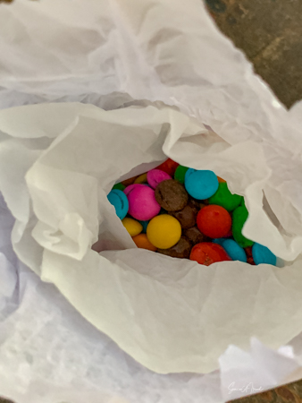 And speaking of food, just in case we were hungry, there were snacks for us. Zapa came out carrying a basket, reminding me of Little Red Riding Hood. Throughout the trip we had snacks of M&M type candies (wrapped in a white paper cone), nuts and raisins (best mixed with the chocolate candies), granola bars and much more.