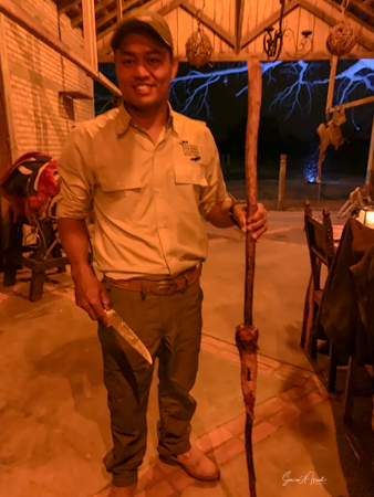 At one point, Zapa stopped the car and had us all climb out. He used his green laser pointer to show us a Great Potoo. We saw a second one a few days later on the river. At first I thought it was an owl, but if you at his face carefully, you can see it is very different.