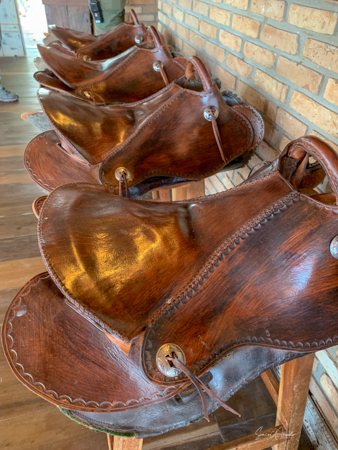 The Pantaneiros have their own way of riding. They use five layers of wool, sheepskin and leather. Two woven wool saddle pads sit on the horse’s back, topped by a leather tree to which leathers and stirrups are attached. The stirrups are merely heavy round metal rings. Next comes a sheepskin either in a natural color or dyed a bright orange, their favorite color. The final layer is a “baldrana,” a large square piece of leather, similar in weight to a pair of chaps. This makes their long days on horseback easier to tolerate.