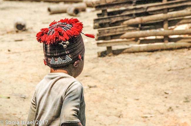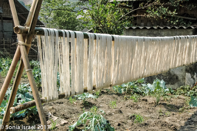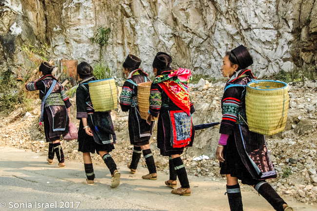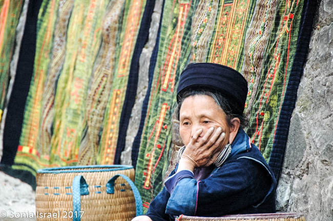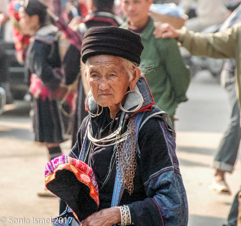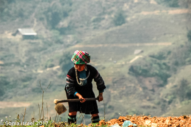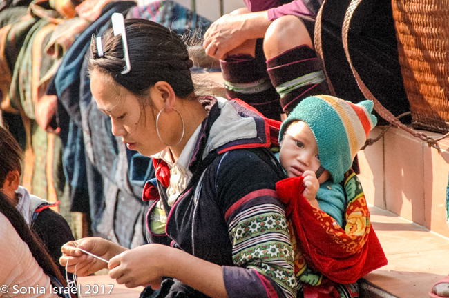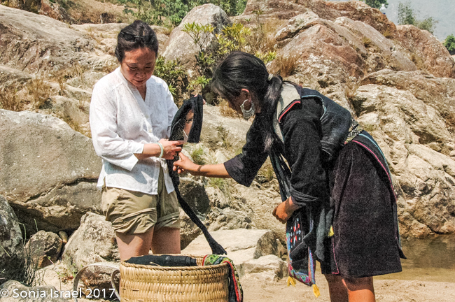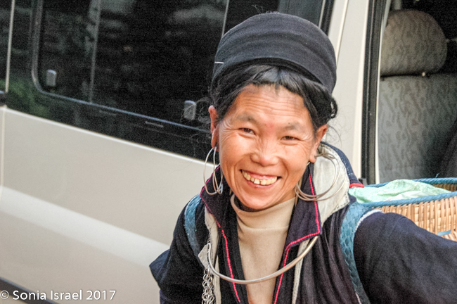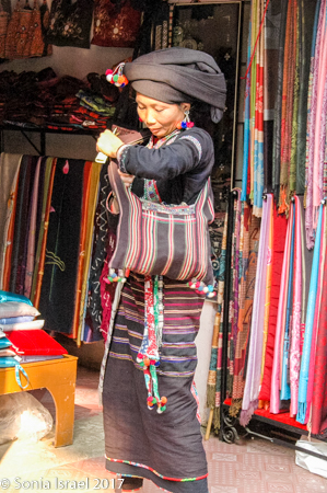 Her name was Nau and she was 28 years old. She never went to school, got married when she was 13, and now has two children – 13 and 14 years old. Her children do not go to school either. They all get up early to work in the fields and then she hits the road, so to speak, to begin selling to tourists (you know – the usual embroidery, bracelets, hats, purses etc). But she spoke English and she explained things to us about the different tribes (more than our guide did!), and when a motor bike would come by, she would move us aside to protect us. And when we climbed down a slippery area, she would hold our hands and help us (more than our guide did!). We enjoyed meeting her, learned a lot about the Hmong traditions and appreciated her patience. Yes, she was after making money, but she earned it. And we did buy things from her with pleasure.