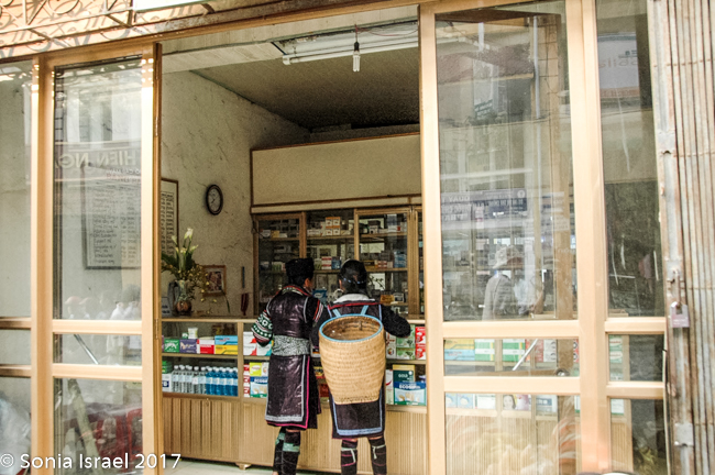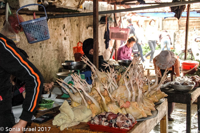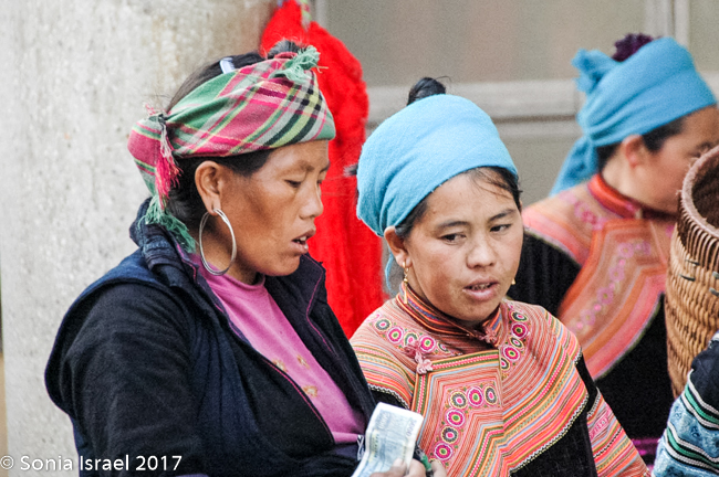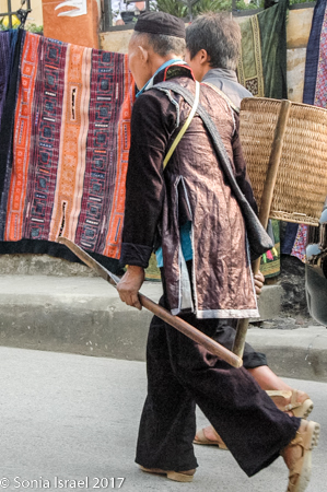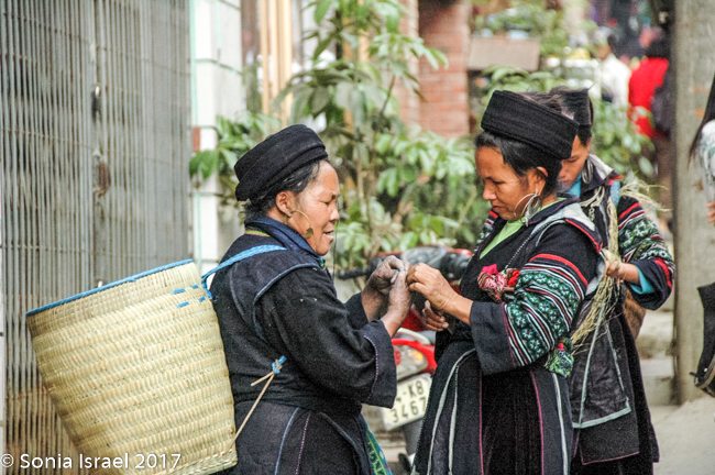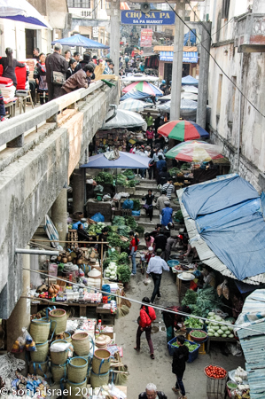 We had breakfast at the Baguette and Chocolate (guess what we had for breakfast…By the way, have I mentioned Vietnamese coffee?  It is very strong and served with condensed milk. Quite delicious). It was a small hotel that rented rooms for $20 a night. We were tempted to rent a room just to shower, but decided to bite the bullet and start the day. After breakfast we had free time for an hour while Hal went to get the permit for our trip into the villages. We walked around the Sapa market watching the different minorities (as they are called) – the Hmong, the Zhao, the Thai, the Thay – selling their vegetables, their fresh fish, fresh meat, and handicrafts. We always enjoy watching the people as they choose which peppers they want, or smell the fruit to decide if it is ripe, or just interact with their friends and neighbors.