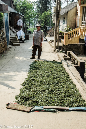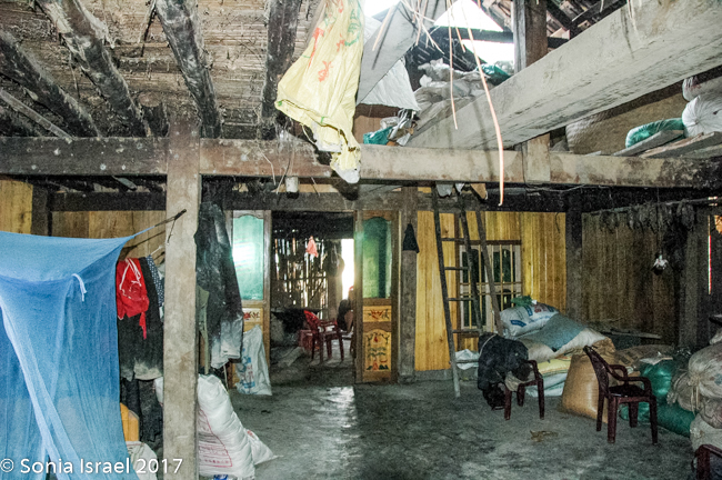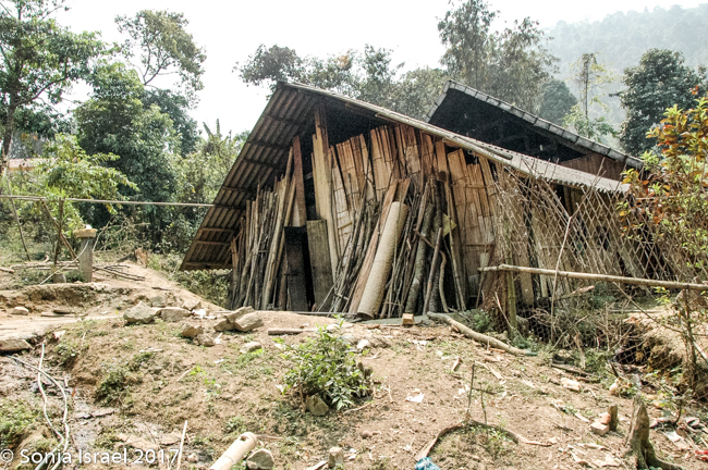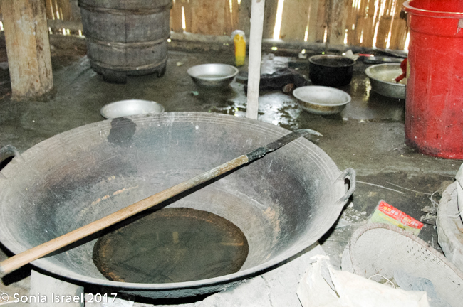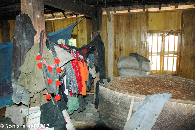 We ended up at a Zhao house, which is quite different from the Thai or Hmong houses. The front room (all dirt floors) housed the kitchen and washing area. There was a small table with very low stools (every one here sits on very low or squats). The Zhau men get married when they are about 13 but they marry women who are 18-22. Why do they marry older women?  Because they need the women to do the work!  The second room was the bedroom and storage room. There was an attic filled with large bags of rice. The back and last room was elaborately painted and held an old armoire with a small TV – I guess that was the TV room. Ten people lived in that house, with three generations (four children).