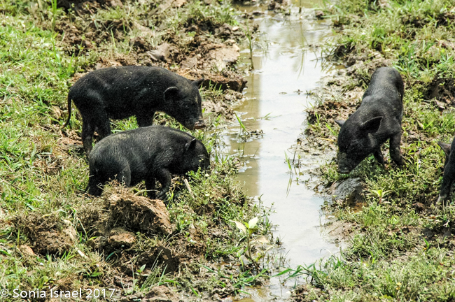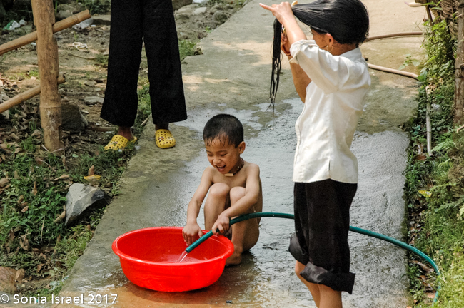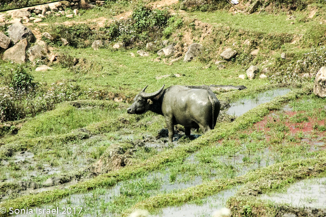 The trek was very interesting as we saw some of each of the minority tribes along the road. We walked for about an hour (did I mention we were doing this in the heat of the day?). We crossed bridges (made of metal which looked quite distressed). We walked up hills and up hills (seems like it was all up hill). Along the way we saw piglets and ducks and chicks and water buffalo. In fact, over the day we saw water buffalo eating along the rice fields, plowing the rice fields, wallowing in the mud, sitting in the water, waling down the street and just hanging around. We saw children climbing on them and men or women leading them. They are a big part of the working culture here.