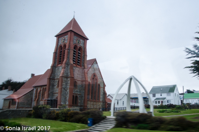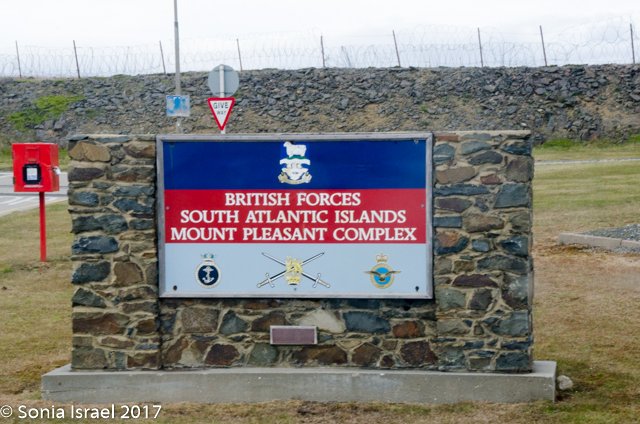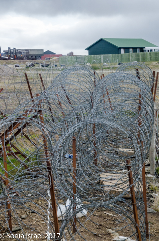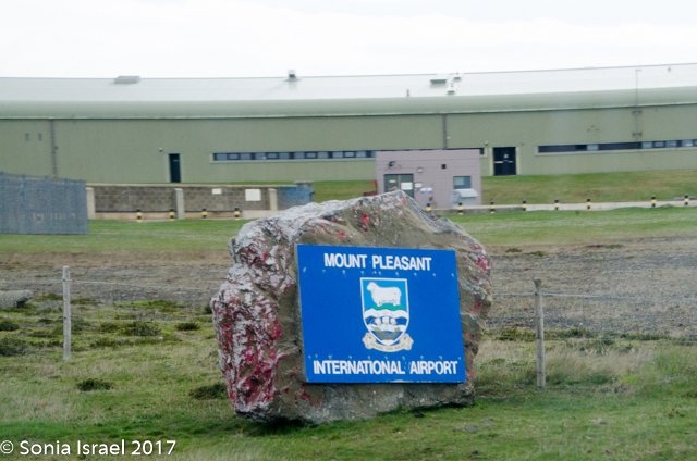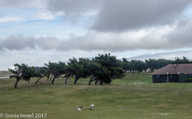 We were bused over to town, where after a quick cup of coffee and some cookies at the Malvinas Hotel, we were taken on an hour drive to the Mount Pleasant International Airport which is on the British Forces South Atlantic Islands Mount Pleasant Complex, i.e., the military base. Our private charter was given special permission to land for one hour (not a moment more) to drop off the next group of guests and take us back to Santiago. (Remember, we came from Buenos Aires, but you can’t fly from the Falklands to Argentina. You now know why). And then we reached the base. It immediately looked different as it had a fence of trees, trees on an island that has almost none. And all the trees were bent with the wind.