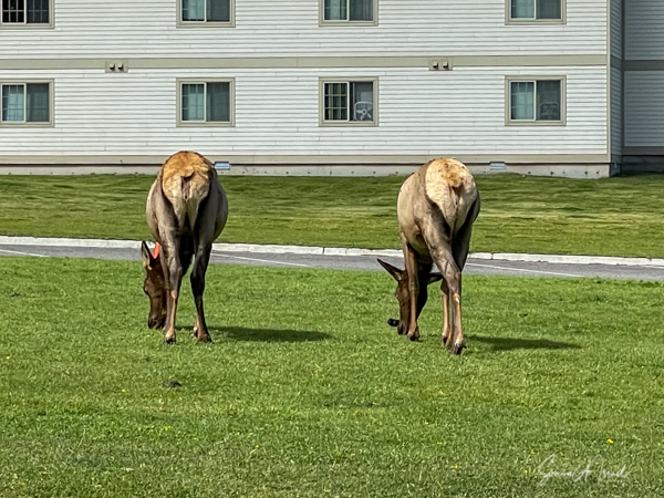 We saw elk everywhere, but the closest we got to them was in Mammoth Hot Springs, where the elk just saunter about in between the cars and the people. Thus Mammoth is nicknamed, “Elk Town.” The elk have learned that if they hang out around people, that protects them from wolves and bears.