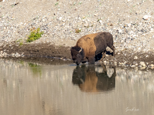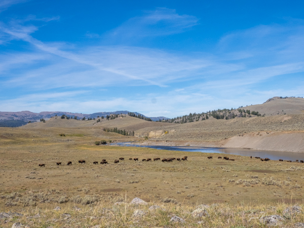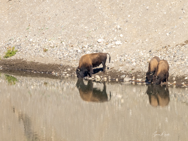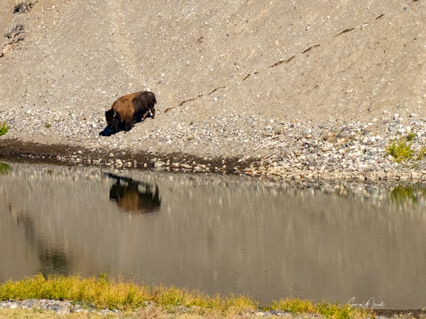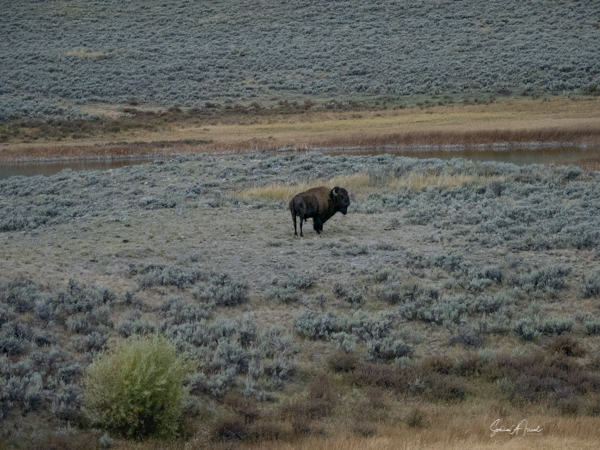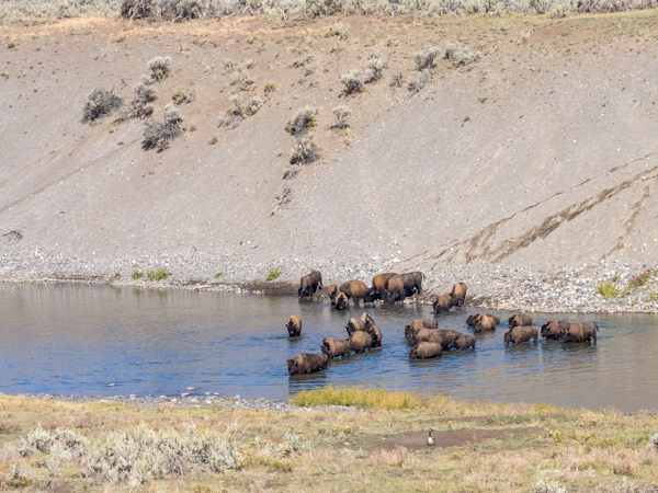 The third time, we saw a herd of buffalo crossing Slough Creek. We quickly pulled over, grabbed our cameras, jumped out of the car, and ran across the road and across a large field, covered in bison dung, to get to the river in time to watch and photograph them.