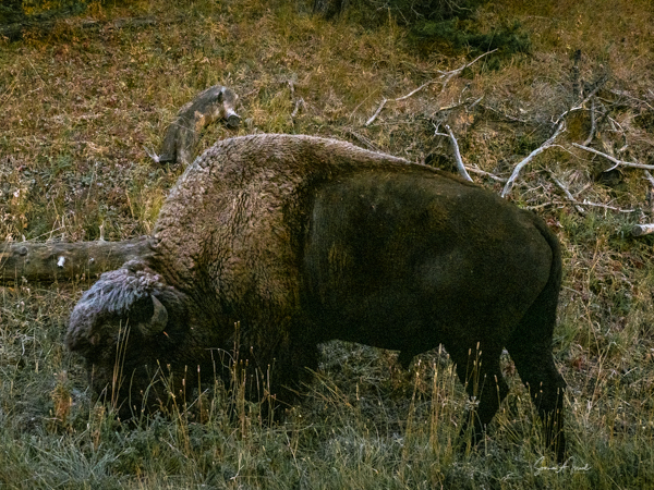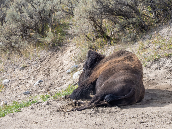In no particular order, the first I remember was one late morning when we spotted a large bison bull (male) walking along the side of the road. We pulled over, stopped, quicky stood up and lifted the roof hatches so we could shoot pictures. This obviously is not an uncommon sight, as there was a sign “watch for bison crossing.” The bull was totally oblivious to all the cars that were either driving slowly by him, or were pulled over, like us, to watch. He walked and walked until he got to a sandy spot, where he dropped down on his knees and rolled over, his feet high in the air. Kurt told us that is how they mark a territory, but also how they scratch their backs. When he was done rolling back and forth, he stood up and meandered away.