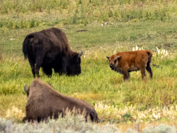 First up are the American bison. Yellowstone has the oldest and largest bison herd in the US and they are believed to be one of only four herds that are free roaming and genetically pure. There were once about 30-60 million bison in North America. In the early 1900s, the number of bison in Yellowstone had dropped to less than 50 (not 50 million, 50). But by 2020, their numbers increased to about 4680. While naturalists are excited at the growing numbers of bison, the local ranchers are less so, fearing that the bison will transmit diseases to their cattle, especially since the bison can wander anywhere they want. There are no fences around Yellowstone and the boundaries are artificial so they can wander off the property – eating and walking and eating and walking. For this reason, national park personnel regularly corral the bison herds and move them back into the park. The bison particularly like to hang out in Paradise Valley as they prefer the lower elevation.