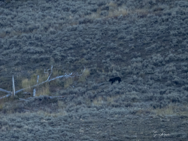 One morning we left the hotel at 6:00am with the hope of finding wolves. We were in Lamar Valley, a place wolves often gather. Lamar Valley, in the northeast part of Yellowstone, lies along the Lamar River. This area is often called the Serengeti of America for it is large and therefore easy to see large animals. Two wolf packs, the Junction Butte and the Lamar Canyon packs, like to hang out here, along with bison, pronghorn, grizzly bears, bald eagles, osprey, deer and coyotes.