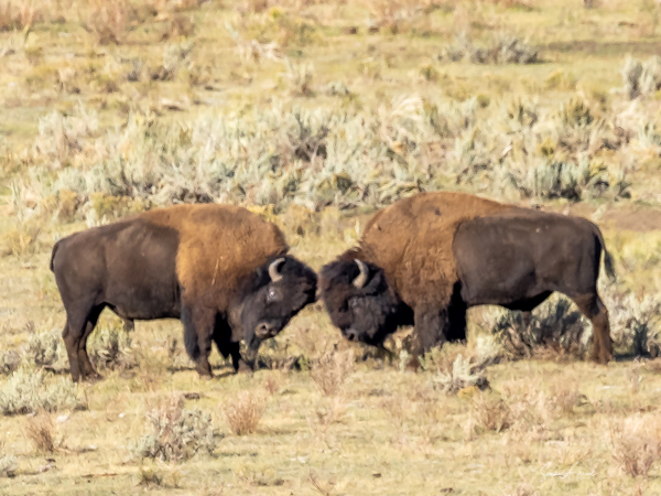 They eyed each other and then locked horns fighting over some female bison in estrus. How do they know if a female bison is in estrus? The males will lick the female’s urine to tell if she is ovulating.