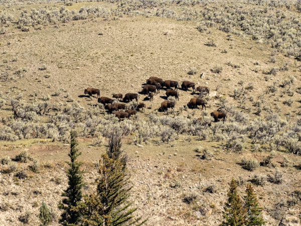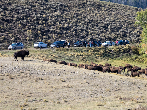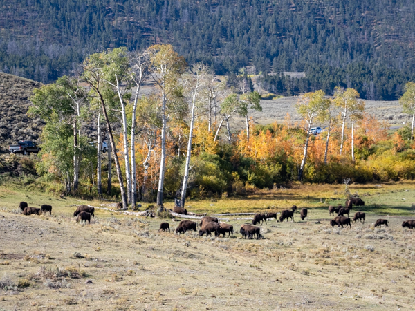 At 930 we had a bathroom and snack stop. Suddenly Kurt yelled, load up quickly. There was a wolf sighting not far away. Kurt hoofed it, driving as fast as he legally could. The chatter on the radio was giving mixed messages as to where the wolves were. Not finding a place to park, Kurt dropped us off to take some landscape shots with a herd of bison. He said he would double back to pick us up.