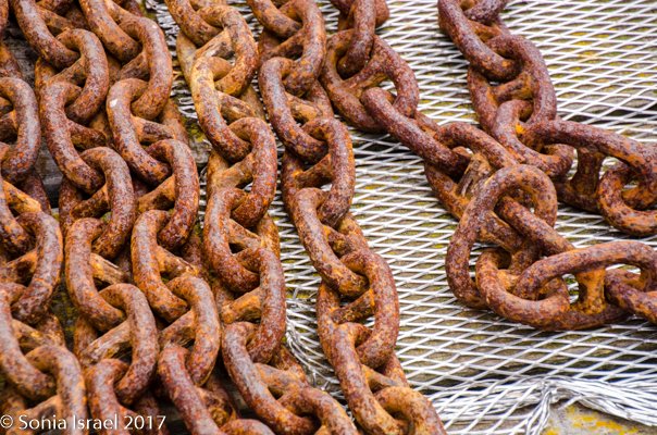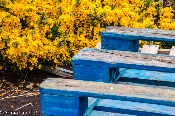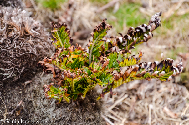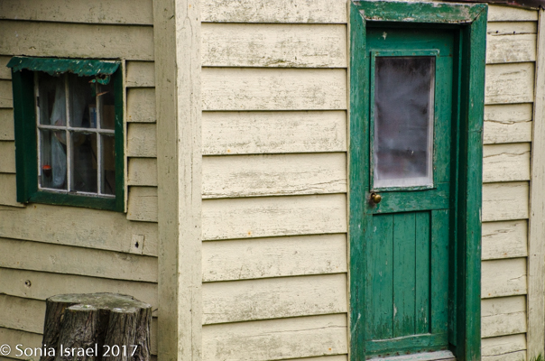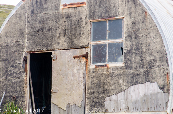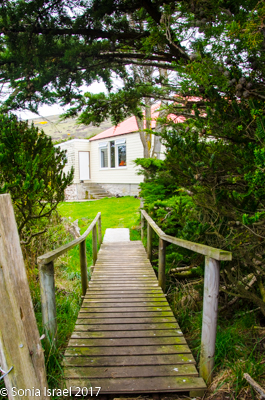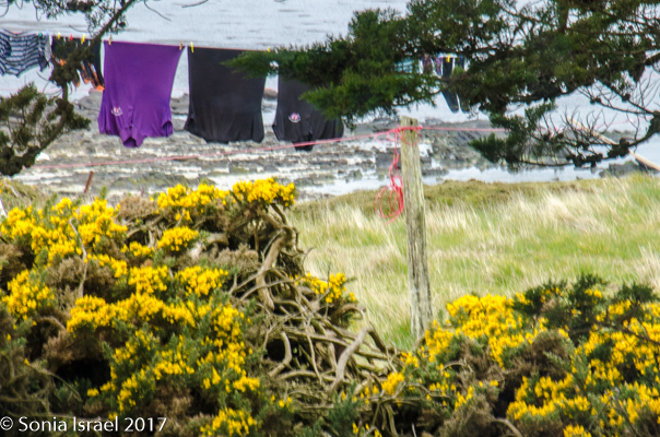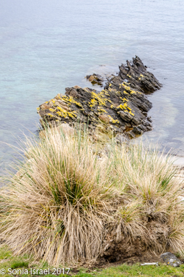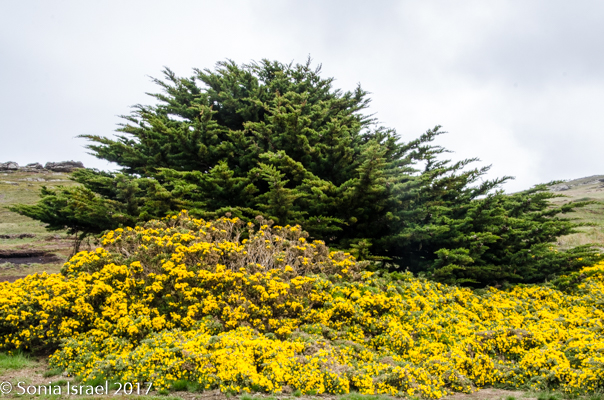 Along the way we admired the aluminum huts, covered in rust. The lichen on the rocks. A bone or skull here and here. Feathers. Geese who totally ignored us. Hedges of yellow gorse, brought from Europe as a living fence as it has thorns, were everywhere, adding to the color. And tussock grass was everywhere. Tussock grass grows all over the Falklands and South Georgia Island. Tussock grows in bunches rather than like a lawn, and on these islands it is very, very, very tall, making it hard to walk through it. Because of the size of the tussock, many birds, including Magellanic penguins, striated caracara, turkey vultures, ducks and geese nest inside the clumps of tussock. There are no native trees here so the tussock spreads all over. The few trees that are here were brought over from other countries, and due to the high winds, grow almost horizontally.