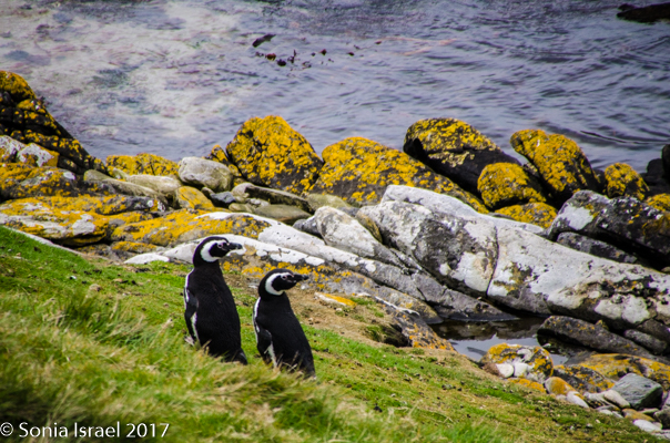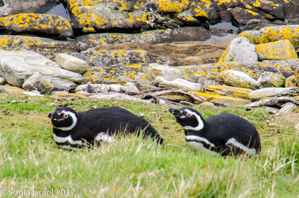 Magellenic penguins are “warmer” weather penguins. They molt feathers to lose heat when they are overheating. And they often stand with their feet in water to cool off. On the Falklands, they are called Jackass penguins (I have no idea why). They weigh about 12 pounds, and as just mentioned, unlike other penguins, they nest in burrows. They are found in the Falklands, Chile and Argentina and can live about 20 years.